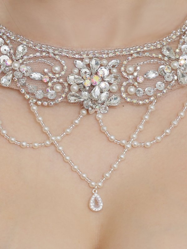 繊細なビジューが首元からサイドへと流れるように輝き、リュクスな印象を与えるドレス。