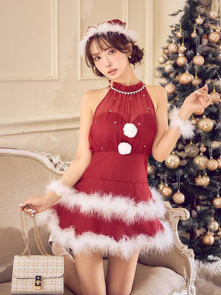 - > 【即日発送】【ノベルティ対象】【送料無料!】【サンタ】シフォンホルターネックティアードサンタコスプレ【コスプレ4点セット】【XS-Lサイズ/2カラー】[OF01/OF04]