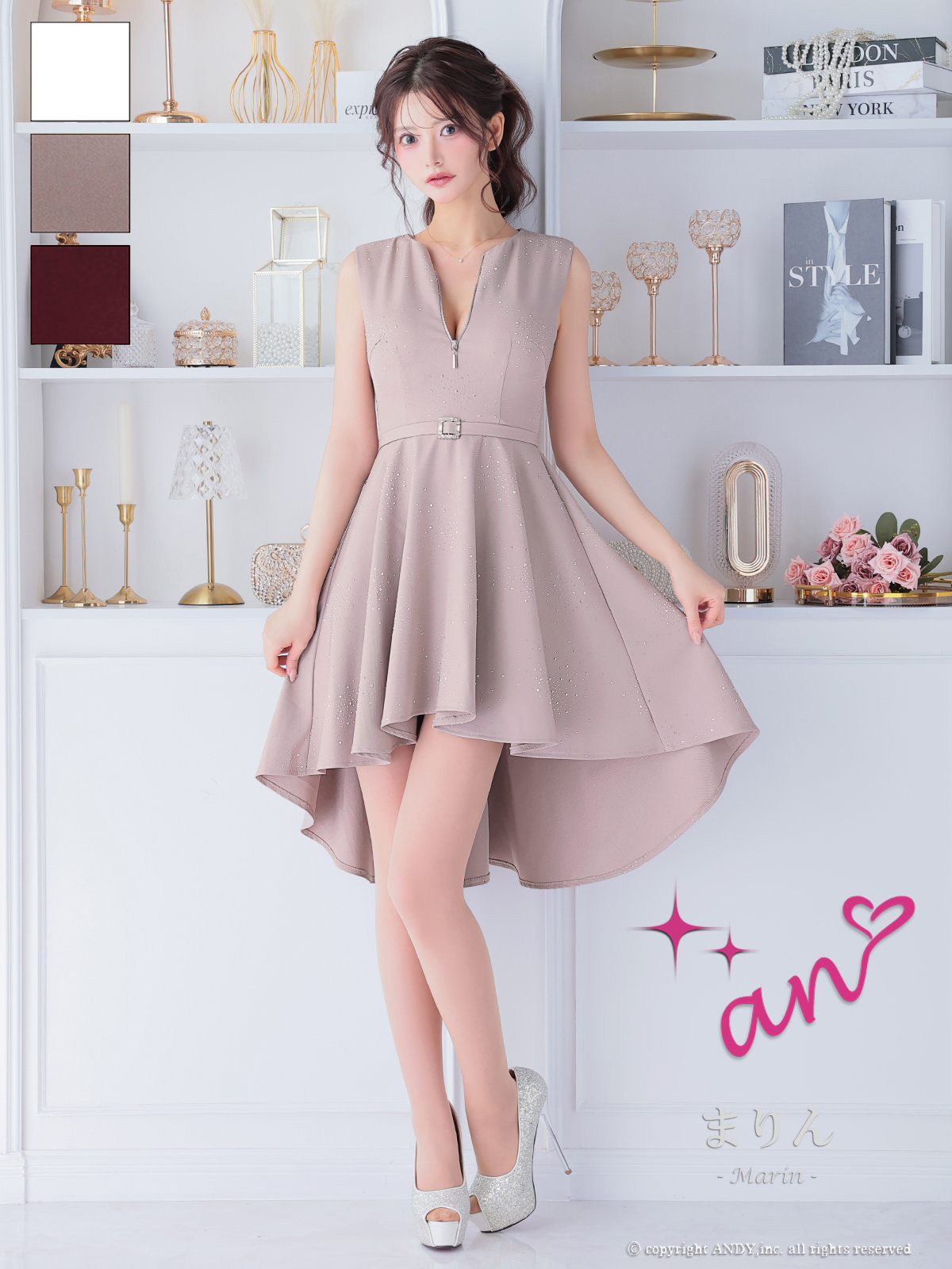 【an/アン】ノースリーブ/ ベルト付き/ フロントジップ/ ビジュー/ フレア/ ミニドレス/ キャバドレス[OF05] [AOC4002-W-2510]