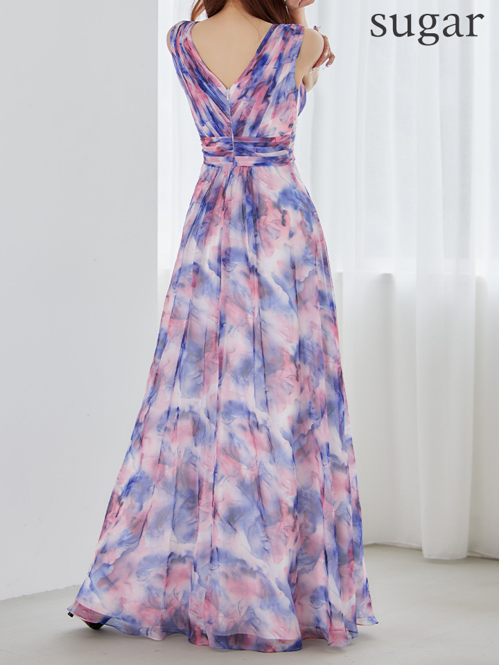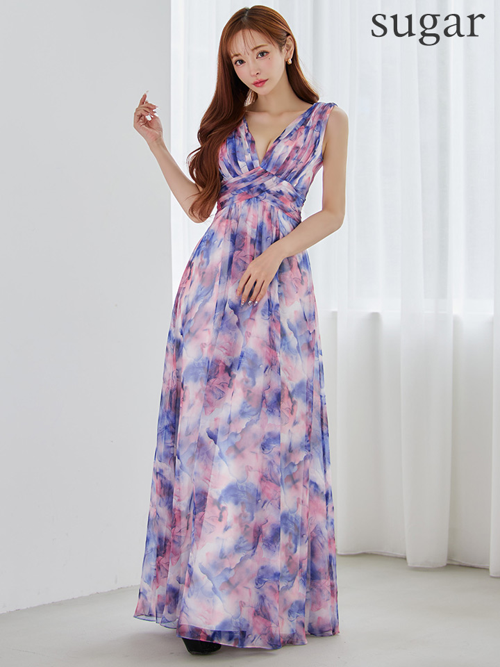 XS-Lサイズあり【SETTAN/セッタン】滲み/ プリント/ シフォン/ Vネック/ バストタック/ ギャザー/ Aライン/ ワンピース/ ロングドレス/ キャバドレス[OF2]