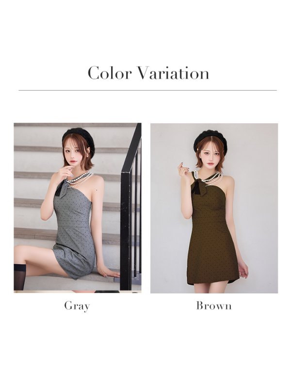 XSサイズあり【ANGEL R/エンジェルアール】デコルテリボン/ アシンメトリーデザイン/ パールチェーン/ ドット/ フレア/ ミニドレス/ キャバドレス[OF2] [AR25249-BR-S251020]