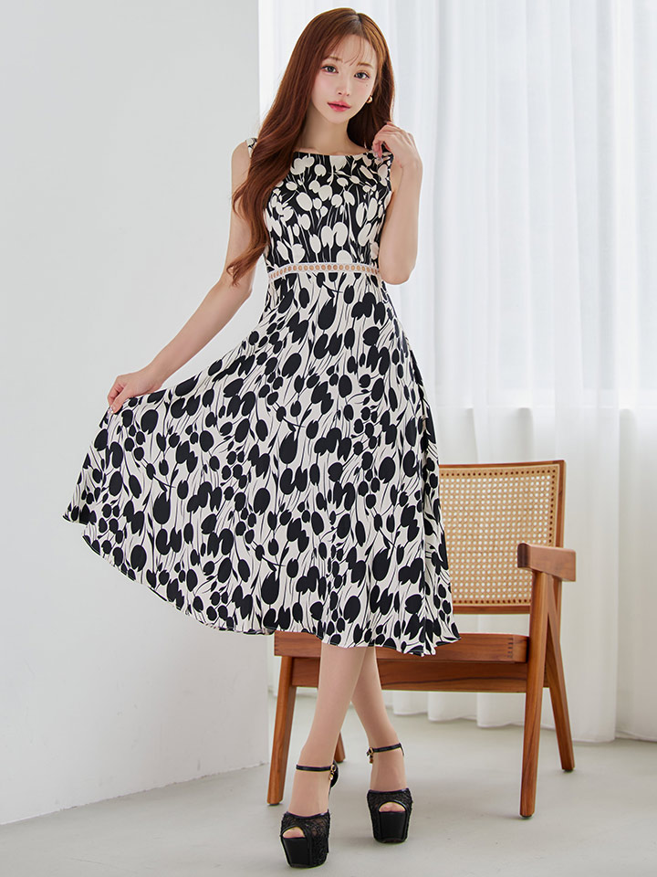 XS-Lサイズあり 【GINZA COUTURE/銀座クチュール】花柄/ バイカラー/ プリント/ ウエストシースルー/ ボートネック/ ノースリーブ/ Aライン/ フレア/ 膝丈/ ミディアムドレス/ キャバドレス[OF2] [LKC25235-BxW-S2510]