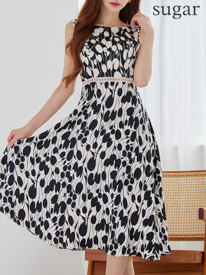- > XS-Lサイズあり 【GINZA COUTURE/銀座クチュール】花柄/ バイカラー/ プリント/ ウエストシースルー/ ボートネック/ ノースリーブ/ Aライン/ フレア/ 膝丈/ ミディアムドレス/ キャバドレス[OF2]