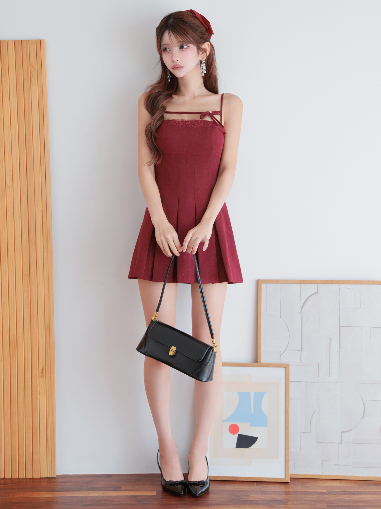 ミニ丈のプリーツが軽やかに揺れ、可憐な印象を引き立てます。