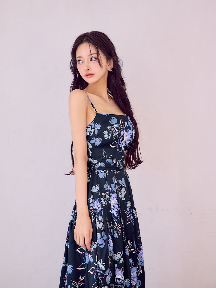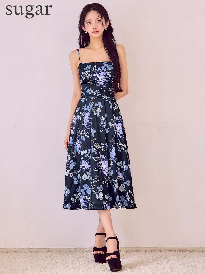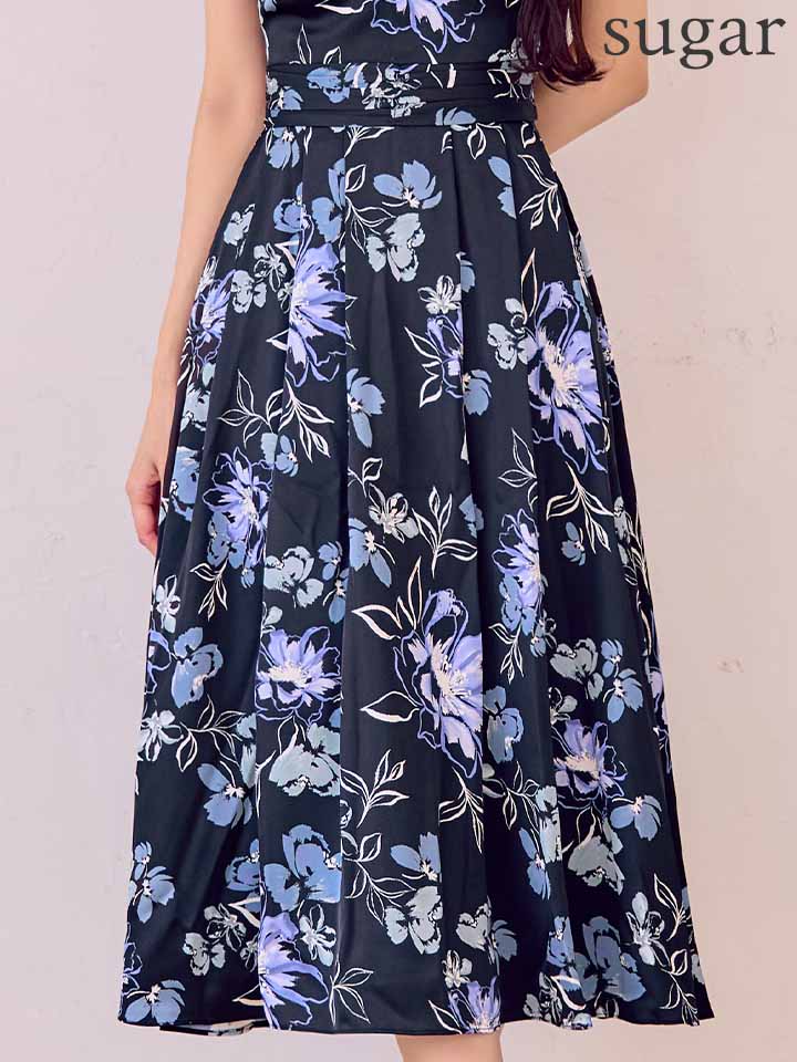 XS-Lサイズあり 【GINZA COUTURE/銀座クチュール】キャミソール/ サテン/ フラワープリント/ タックスカート/ Aライン/ ワンピース/ ミモレ丈/ ミディアムドレス/ キャバドレス[OF2] [LKC25043-BxPL-S2510]