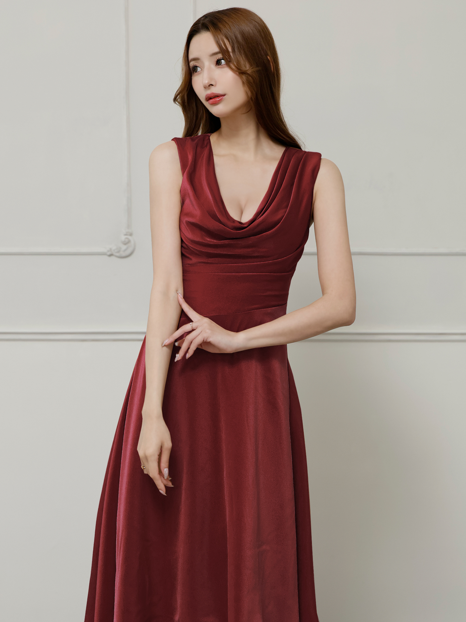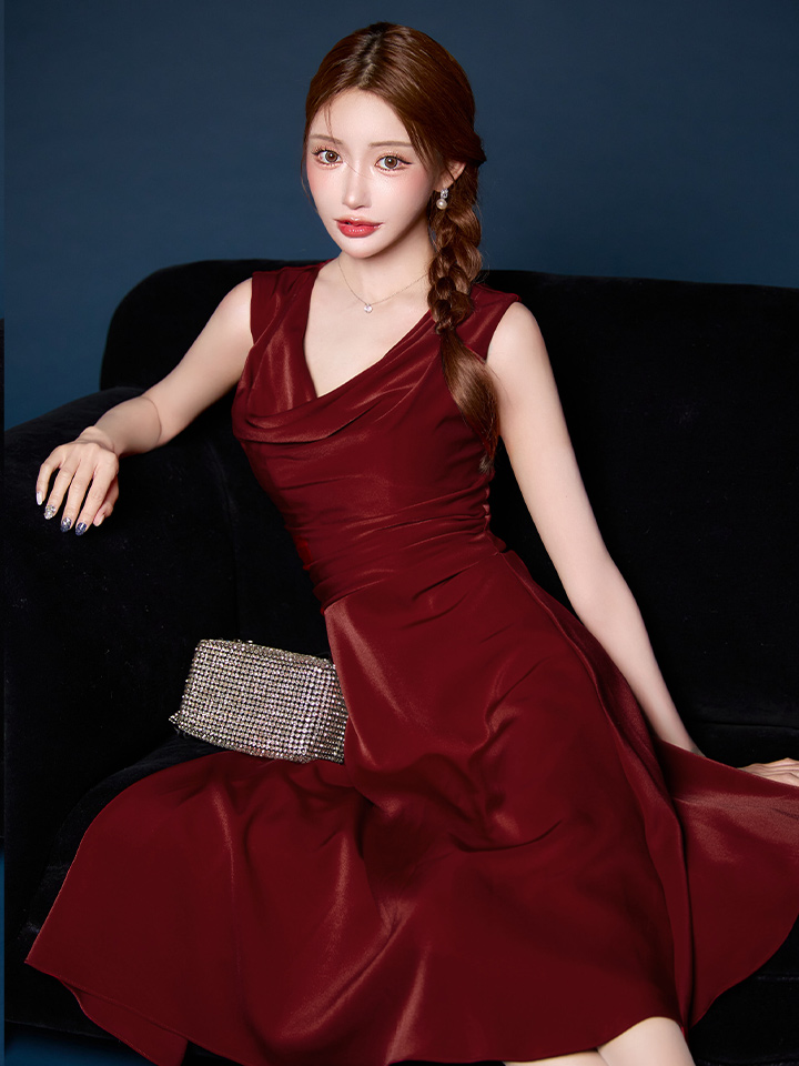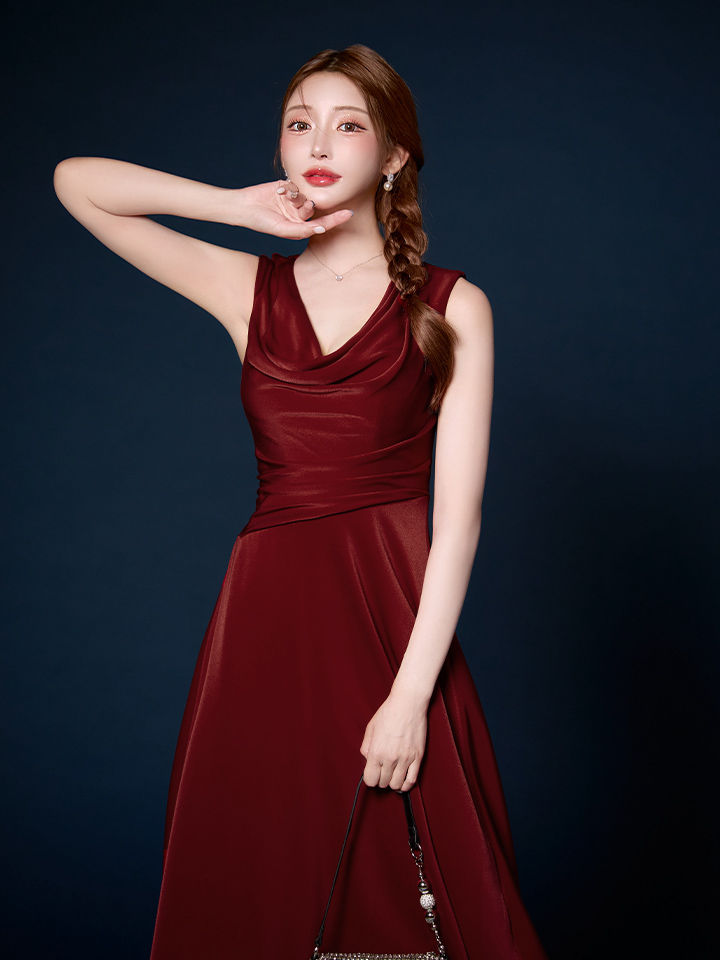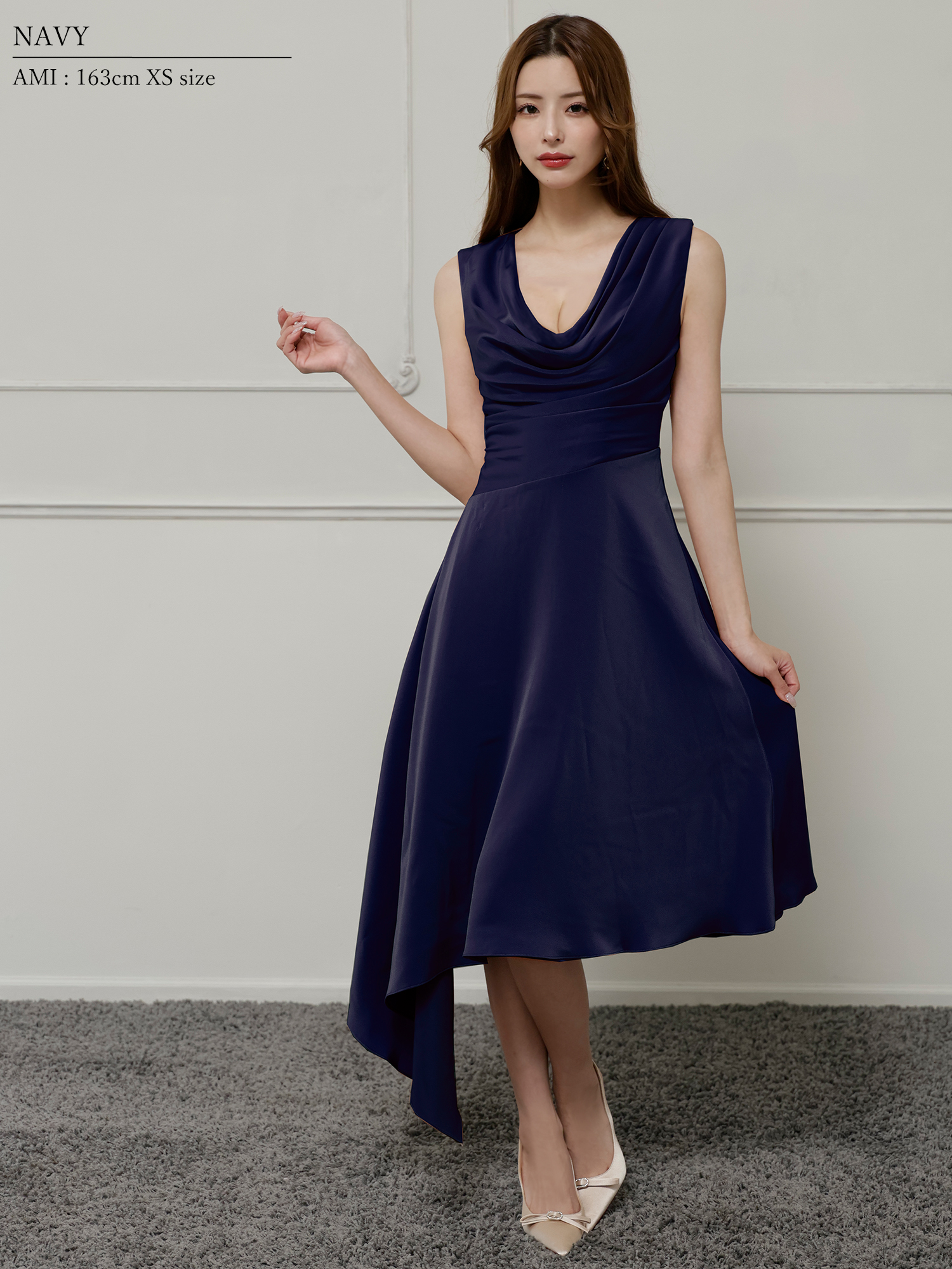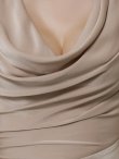 デコルテを引き立てる流れるようなドレープが、上品な女性らしさを演出。
