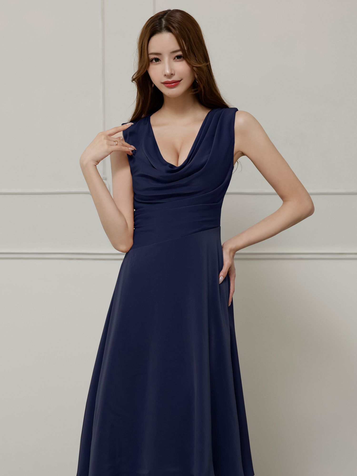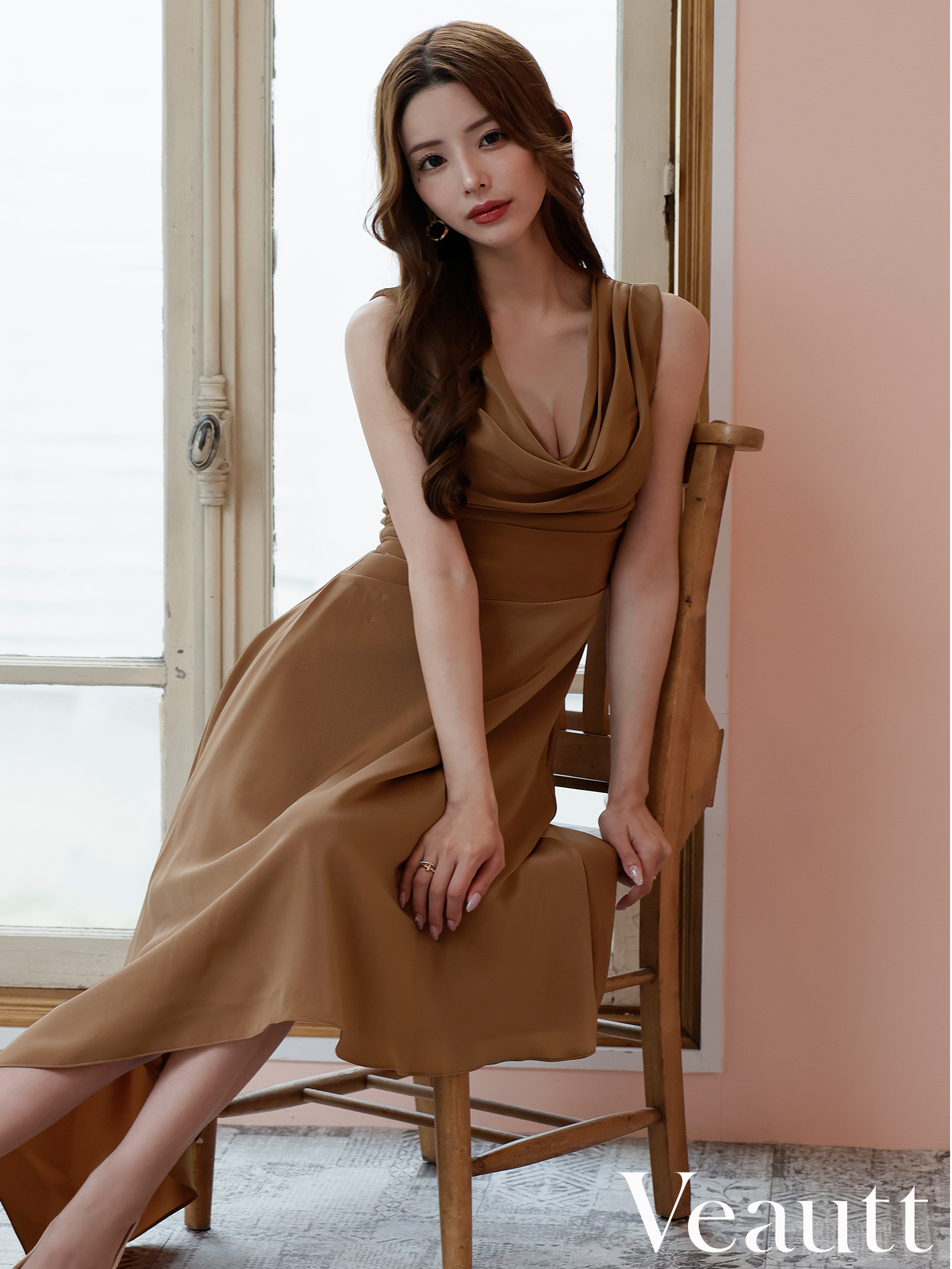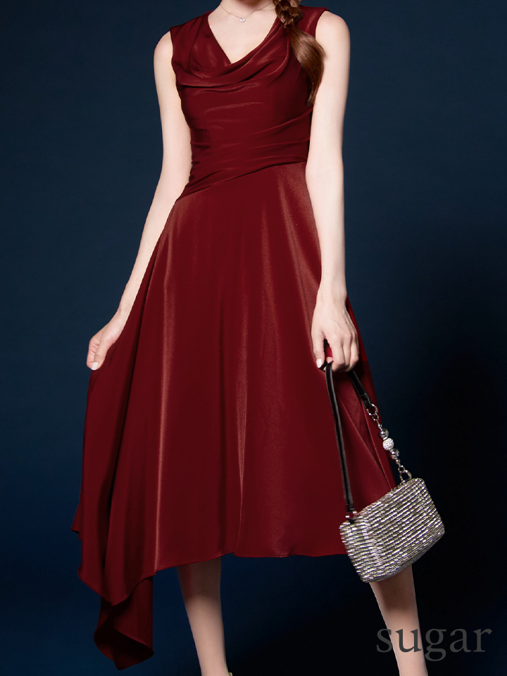 デコルテを引き立てる流れるようなドレープが、上品な女性らしさを演出。