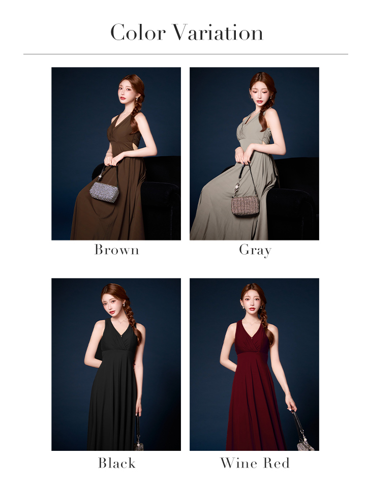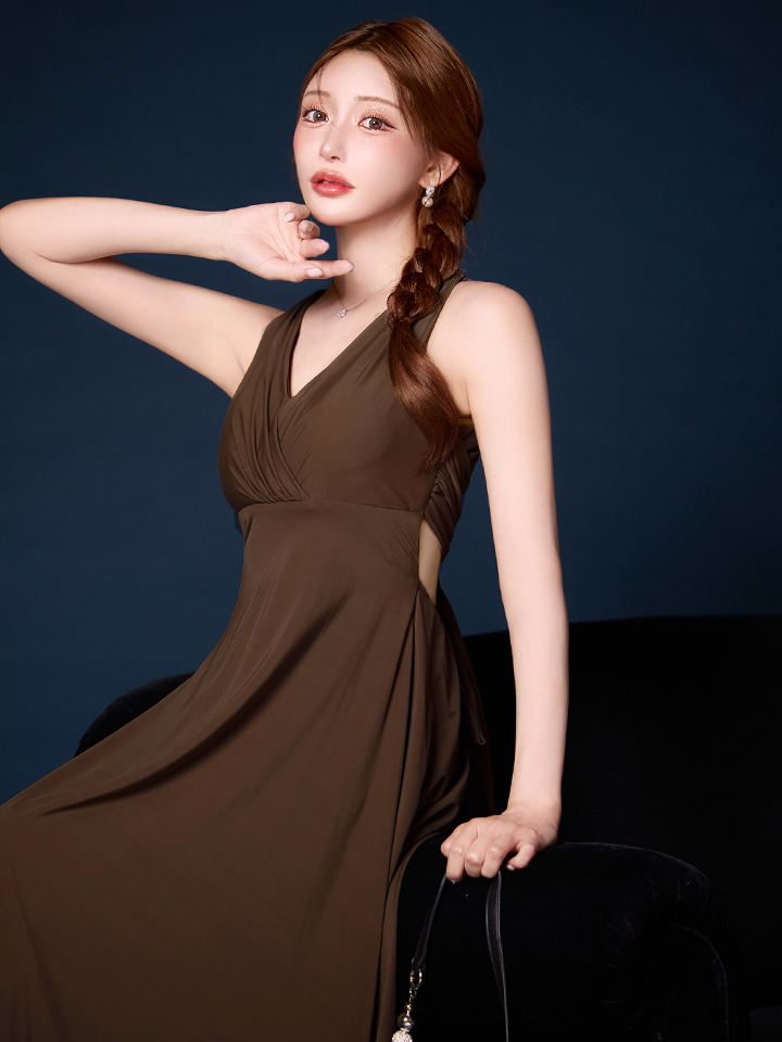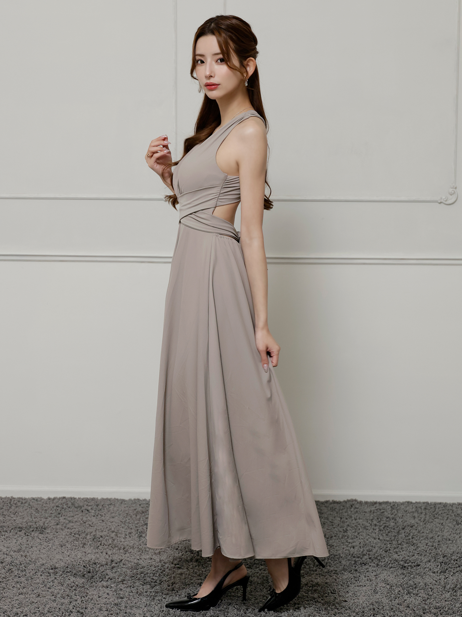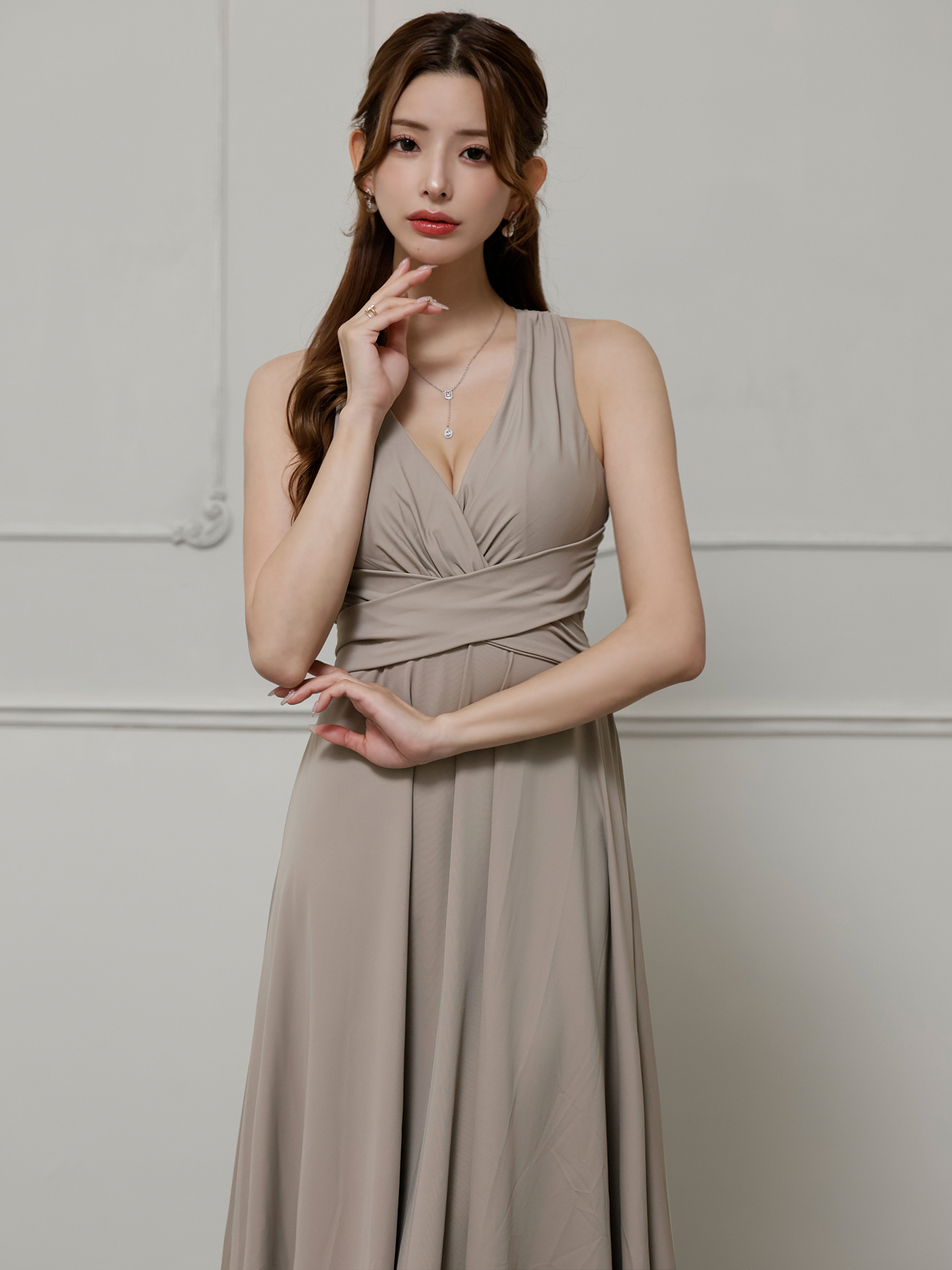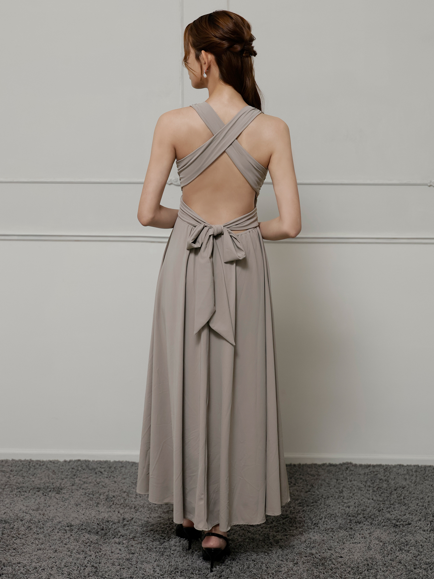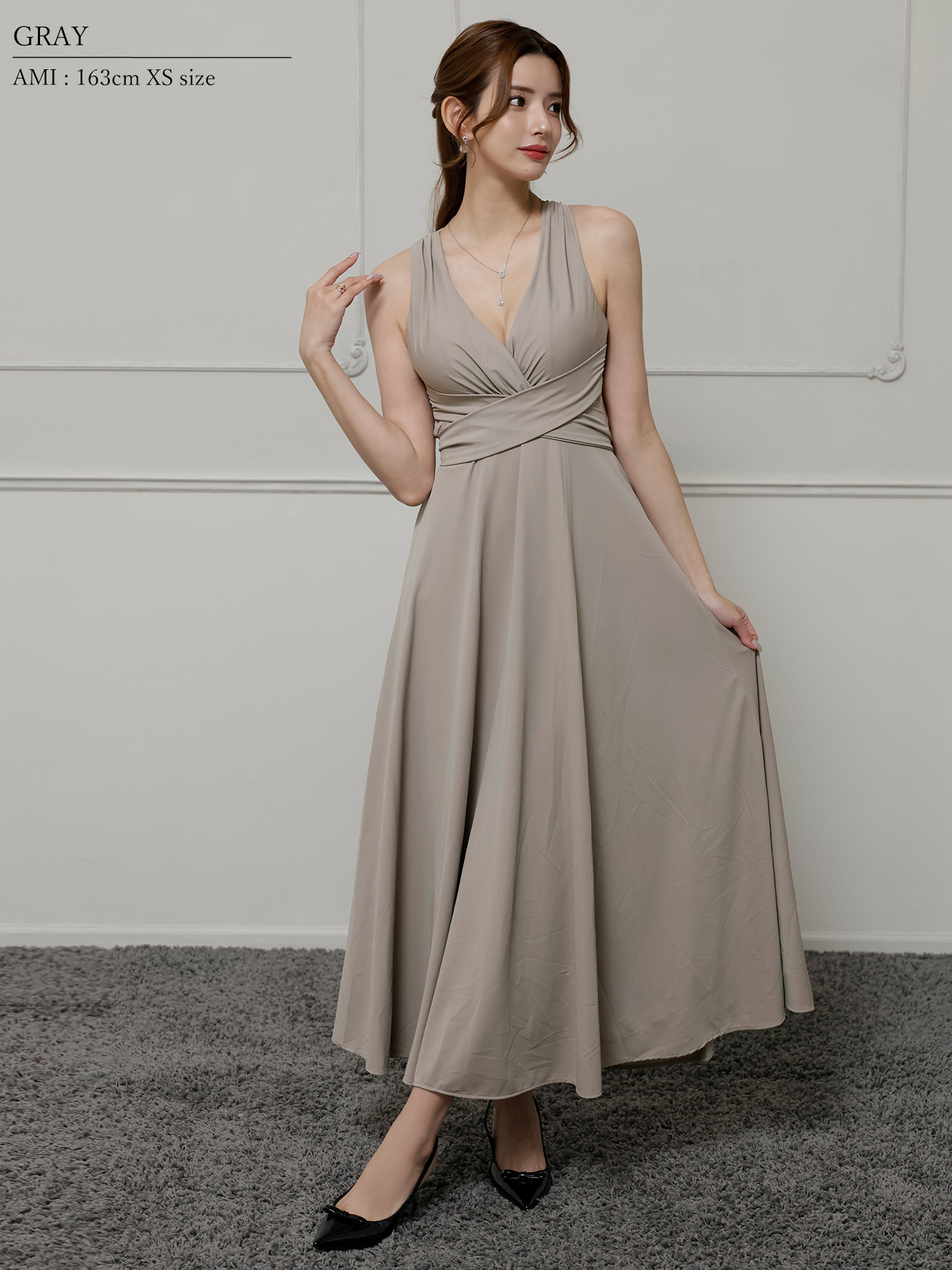 【予約商品/10月中旬-10月下旬発送予定】XSサイズあり【Veautt/ヴュート】【OF05】Vカット/ ウエストクロス/ バックオープン/ リボン/ フレア/ ロングドレス/ キャバドレス [VT022525-GY-S251023]