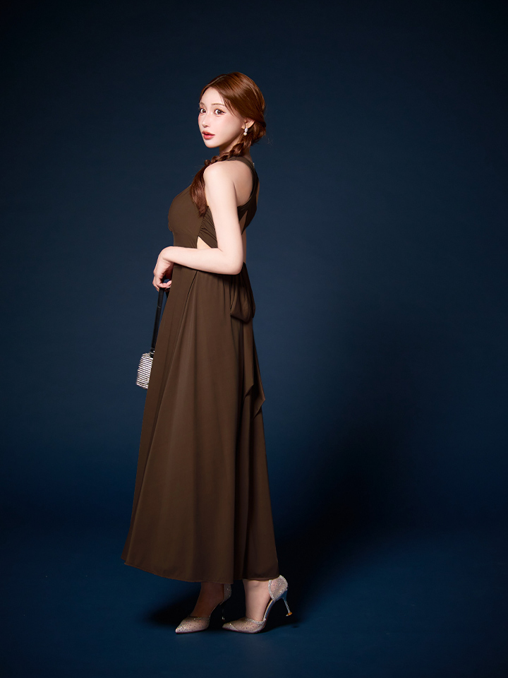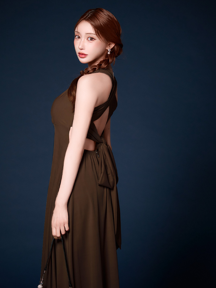 クロスバックとリボン結びが、後ろ姿に印象的なアクセントをプラス。