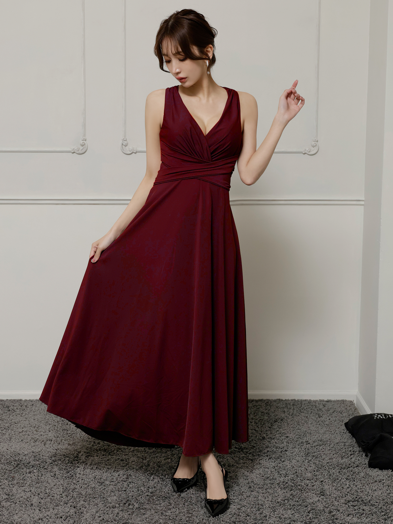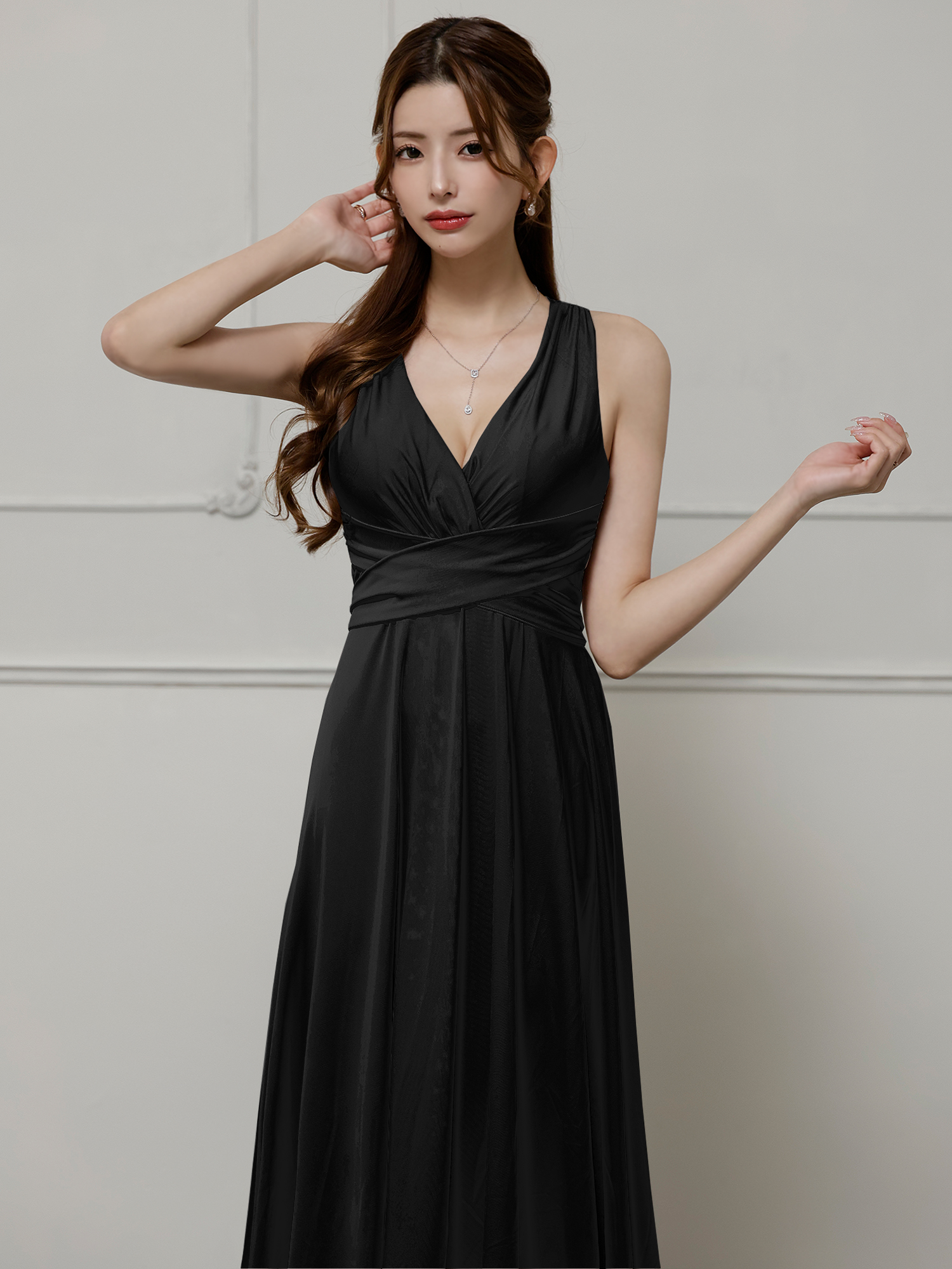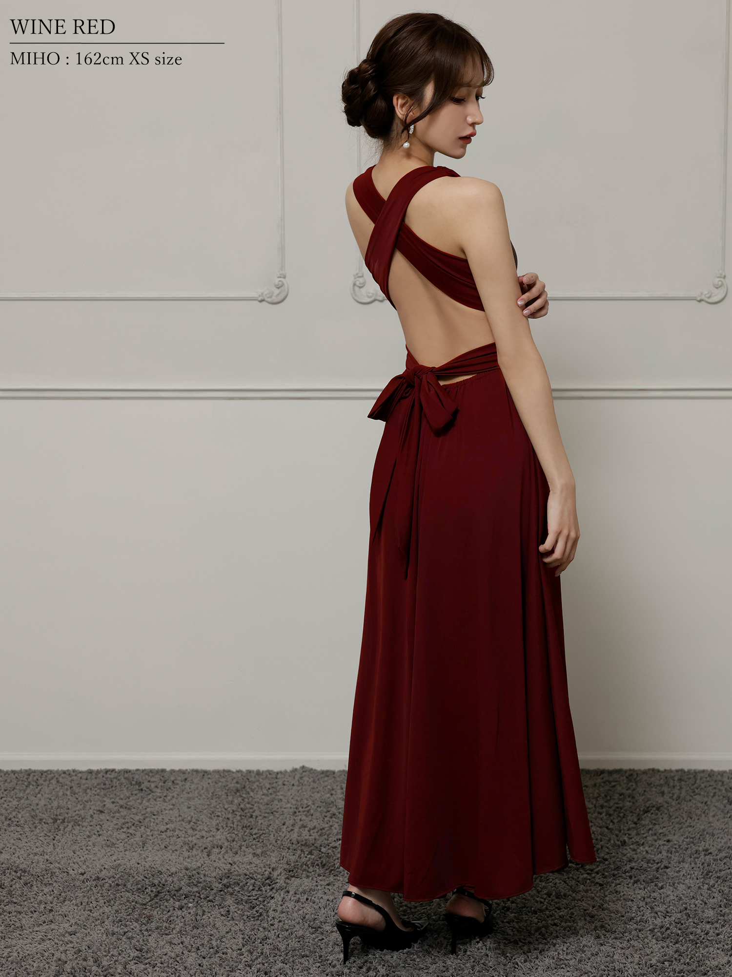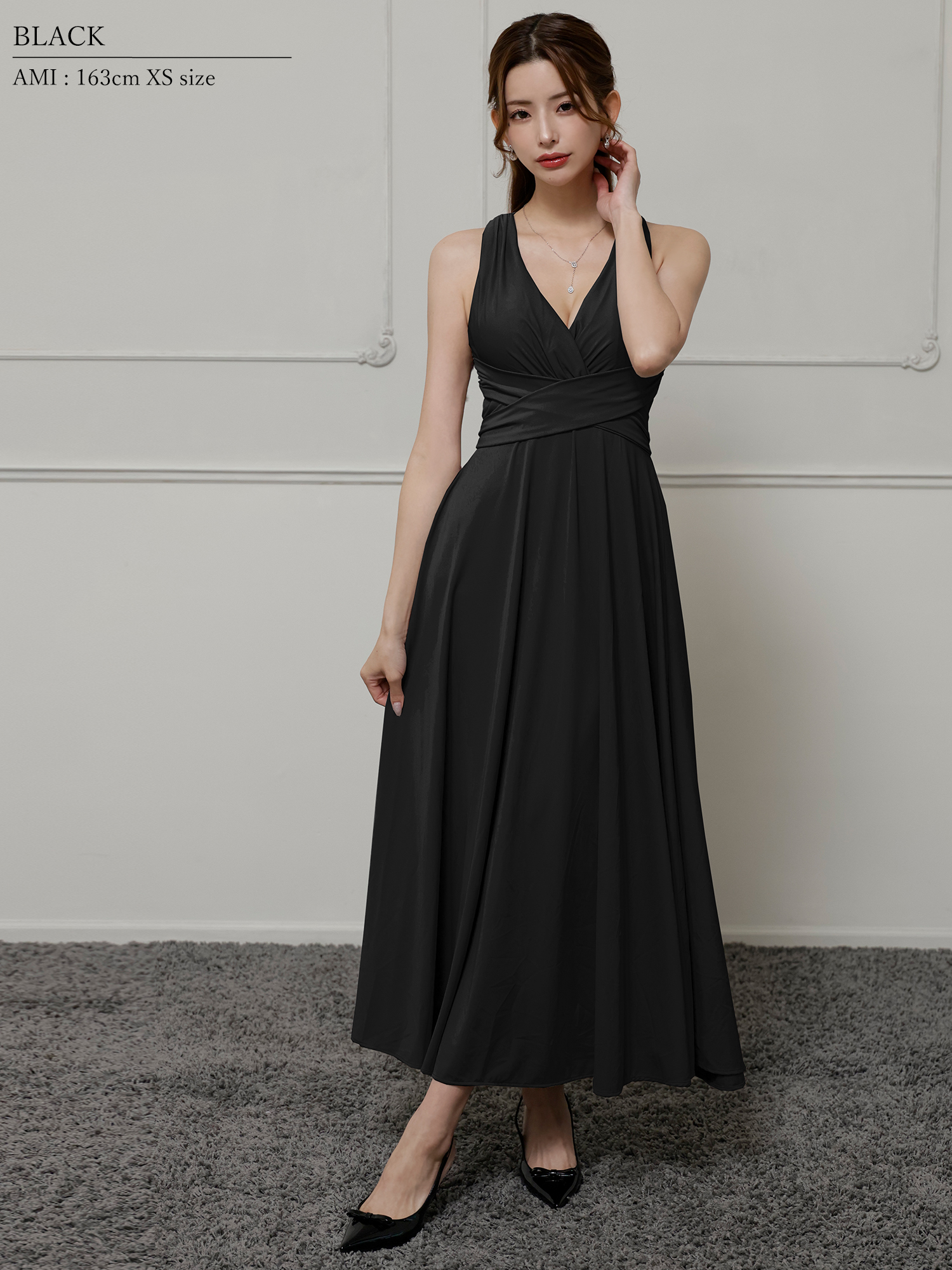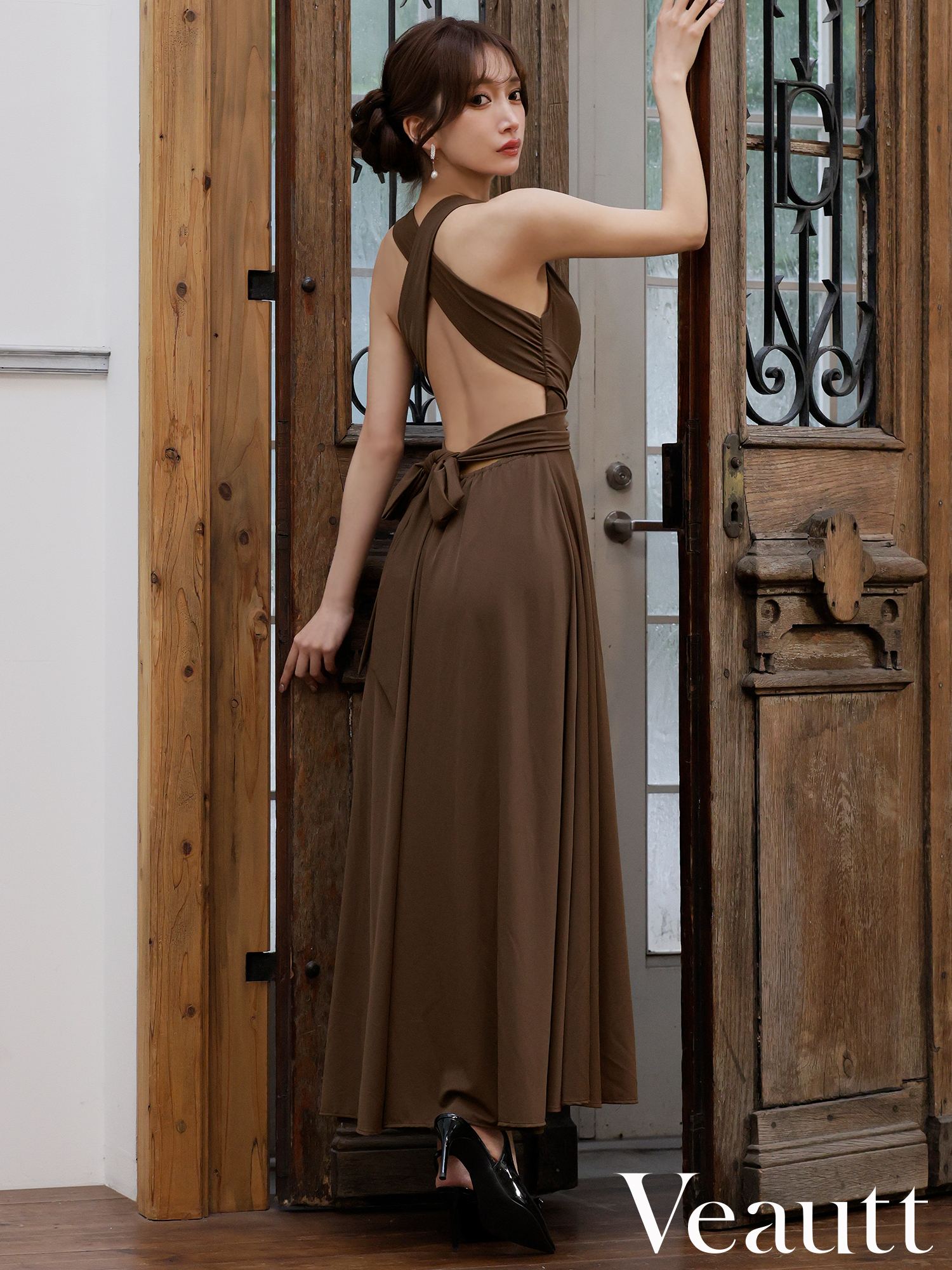 【予約商品/10月中旬-10月下旬発送予定】XSサイズあり【Veautt/ヴュート】【OF05】Vカット/ ウエストクロス/ バックオープン/ リボン/ フレア/ ロングドレス/ キャバドレス