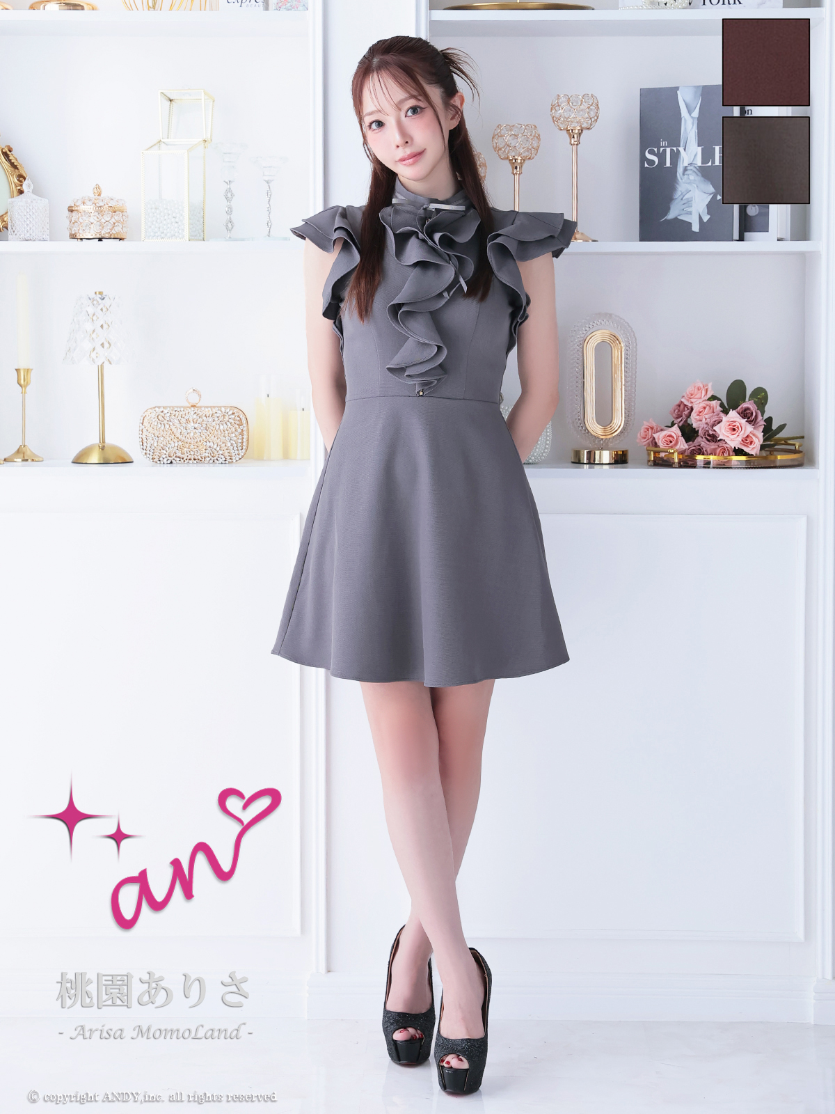 XSサイズあり【an/アン】フリル/ ハイネック/ ショートスリーブ/ Aライン/ フレア/ ミニドレス/ キャバドレス[OF05] [AOC3991-BR-2510]
