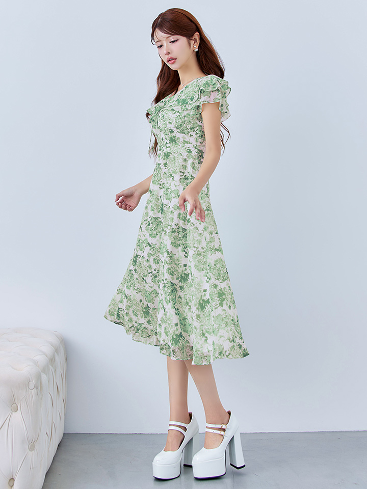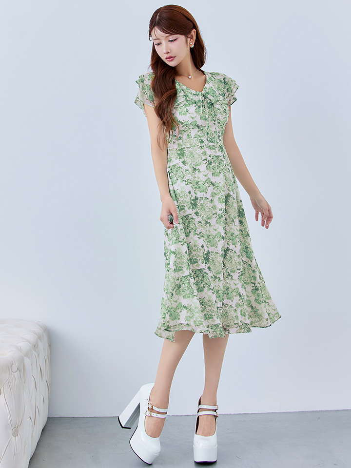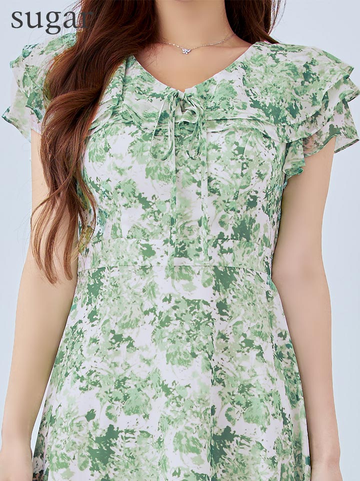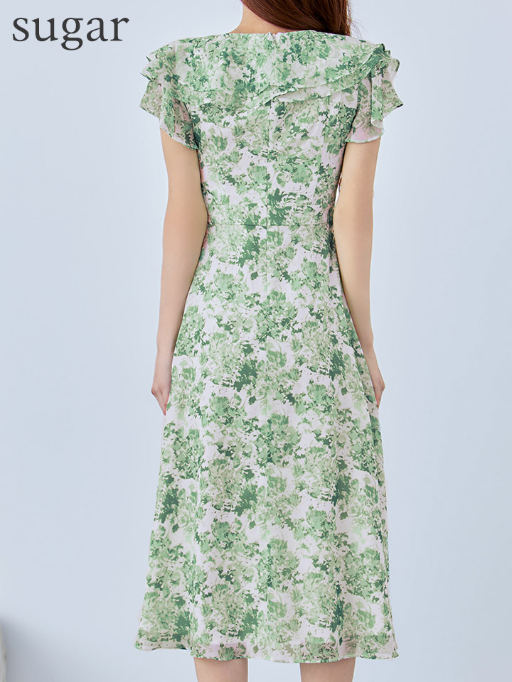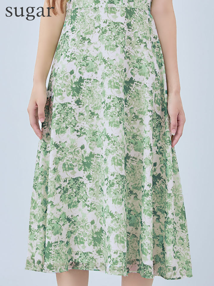 リーフ柄の様なプリントとシフォンの透け感が爽やかなミディアムドレス♡