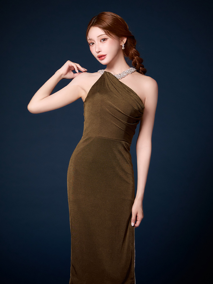 XSサイズあり【Veautt/ヴュート】【OF05】ネックビジュー/ ドレープ/ ファスナー/ スリット/ タイト/ ミディアムドレス/ キャバドレス【一部予約商品/10月中旬-10月下旬発送予定】 [VT11232-GR-S251023]