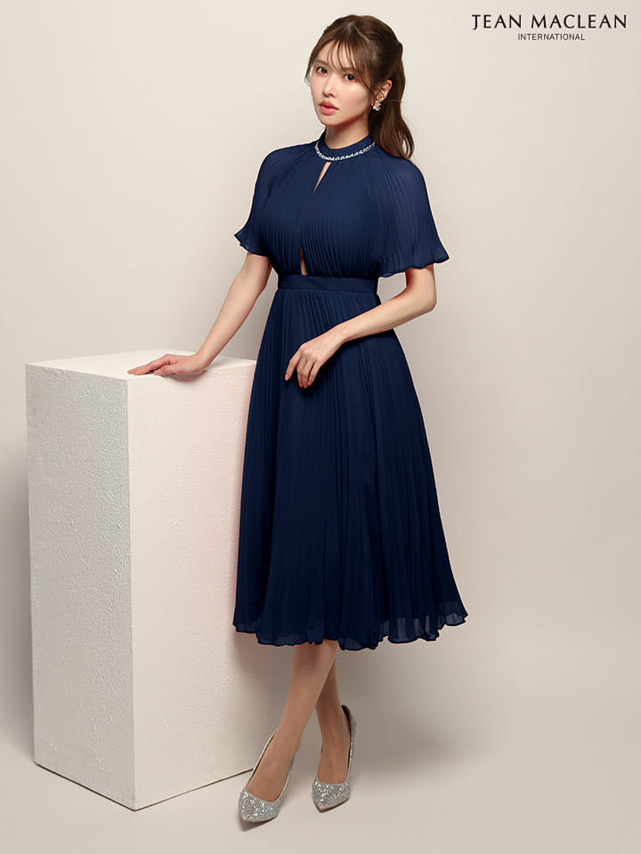 Lサイズあり【JEAN MACLEAN/ジャンマクレーン】ネックビジュー/ ハーフスリーブ/ シフォン/ カットアウト/ プチハイネック/ プリーツ/ フレア/ ミディアムドレス/ キャバドレス[OF2A] [51943-JM-NV-2510]