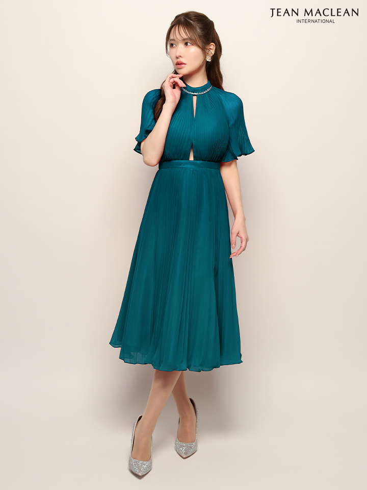 Lサイズあり【JEAN MACLEAN/ジャンマクレーン】ネックビジュー/ ハーフスリーブ/ シフォン/ カットアウト/ プチハイネック/ プリーツ/ フレア/ ミディアムドレス/ キャバドレス[OF2A]