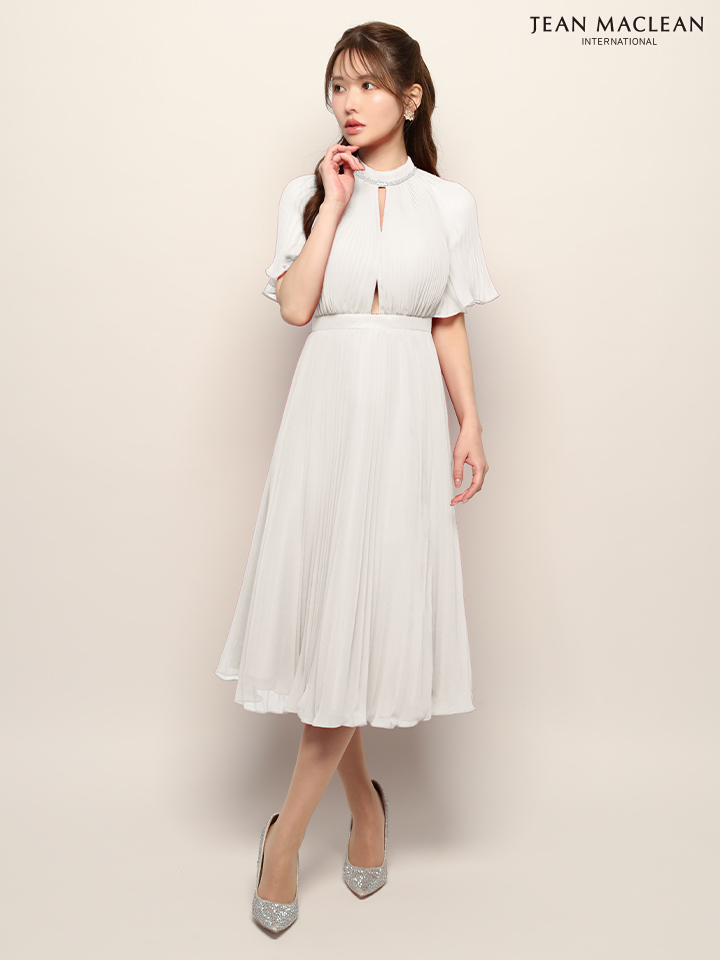 - > Lサイズあり【JEAN MACLEAN/ジャンマクレーン】ネックビジュー/ ハーフスリーブ/ シフォン/ カットアウト/ プチハイネック/ プリーツ/ フレア/ ミディアムドレス/ キャバドレス[OF2A]