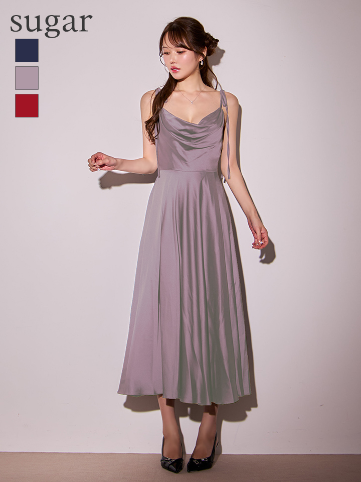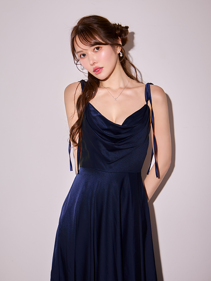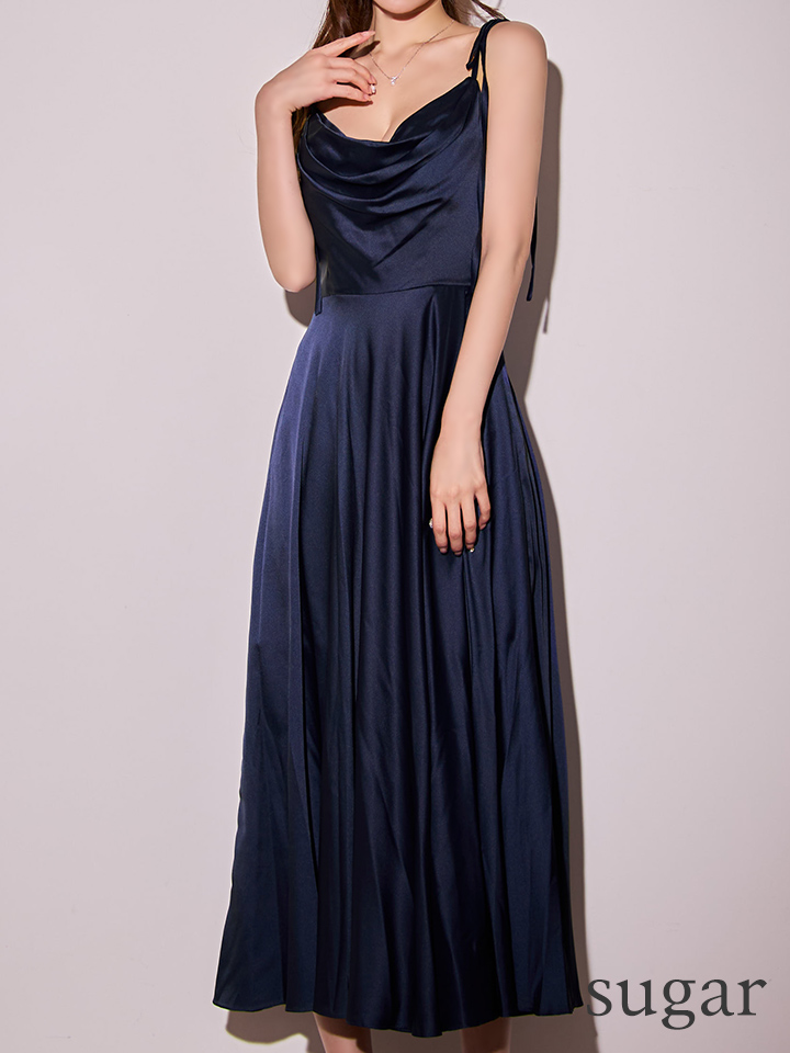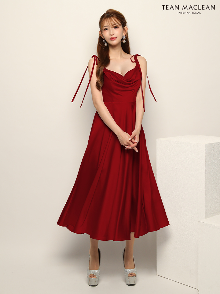 オリジナルカラー・Lサイズあり【JEAN MACLEAN/ジャンマクレーン】ショルダーリボン/ バストドレープ/ キャミソール/ サテン/ ハイウエスト/ Aライン/ フレア/ ミディアムドレス/ キャバドレス[OF2A] [51942-JM-BGD-S251024]