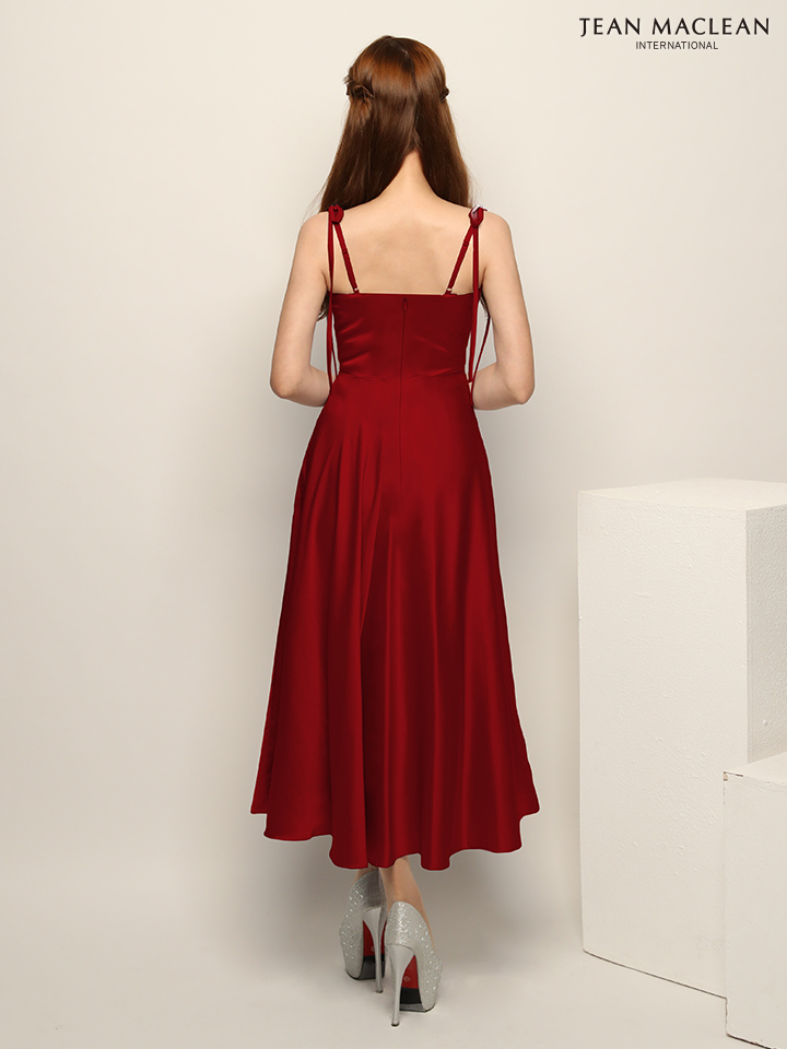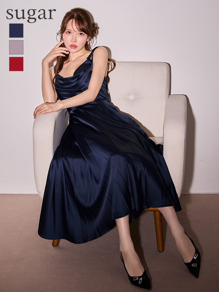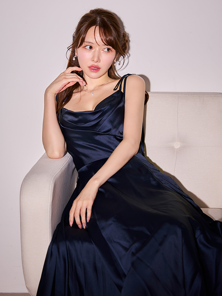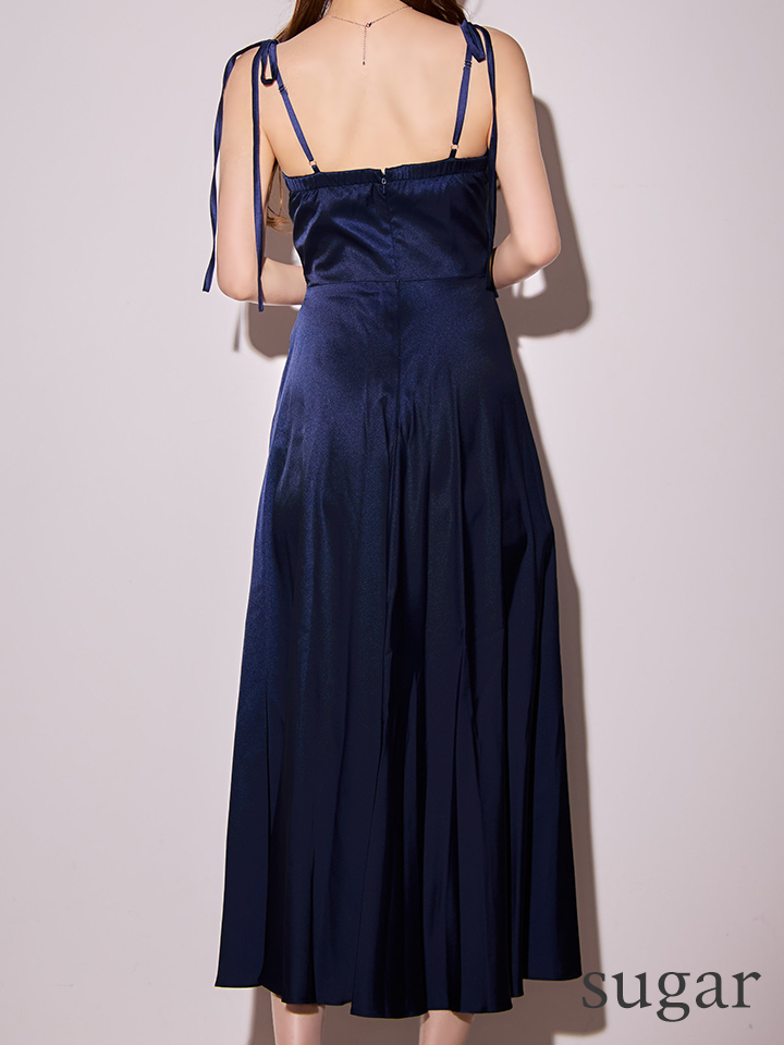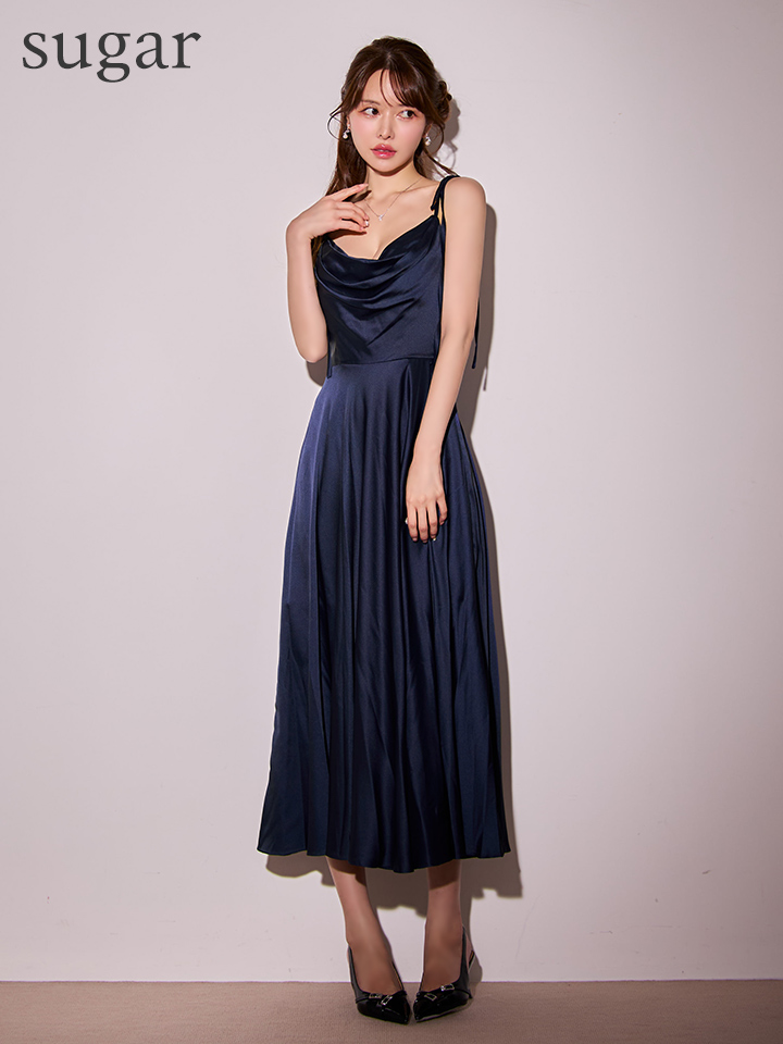 オリジナルカラー・Lサイズあり【JEAN MACLEAN/ジャンマクレーン】ショルダーリボン/ バストドレープ/ キャミソール/ サテン/ ハイウエスト/ Aライン/ フレア/ ミディアムドレス/ キャバドレス[OF2A] [51942-JM-BGD-S251024]