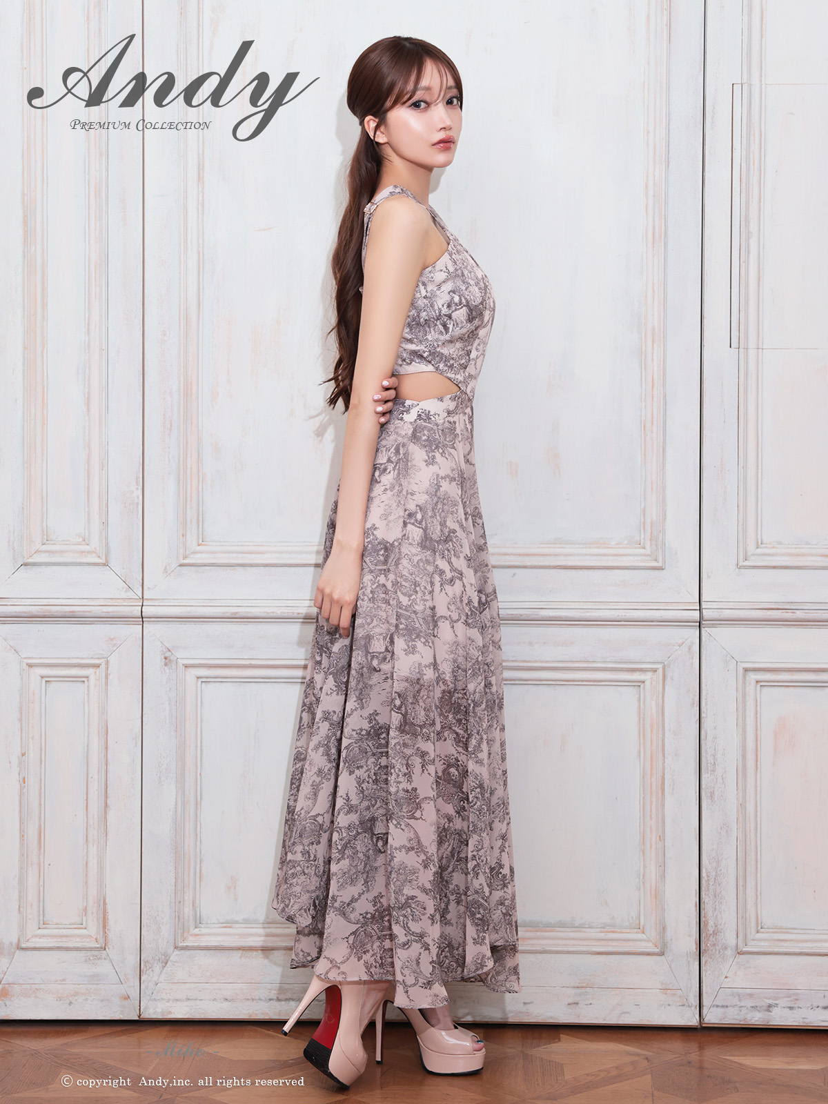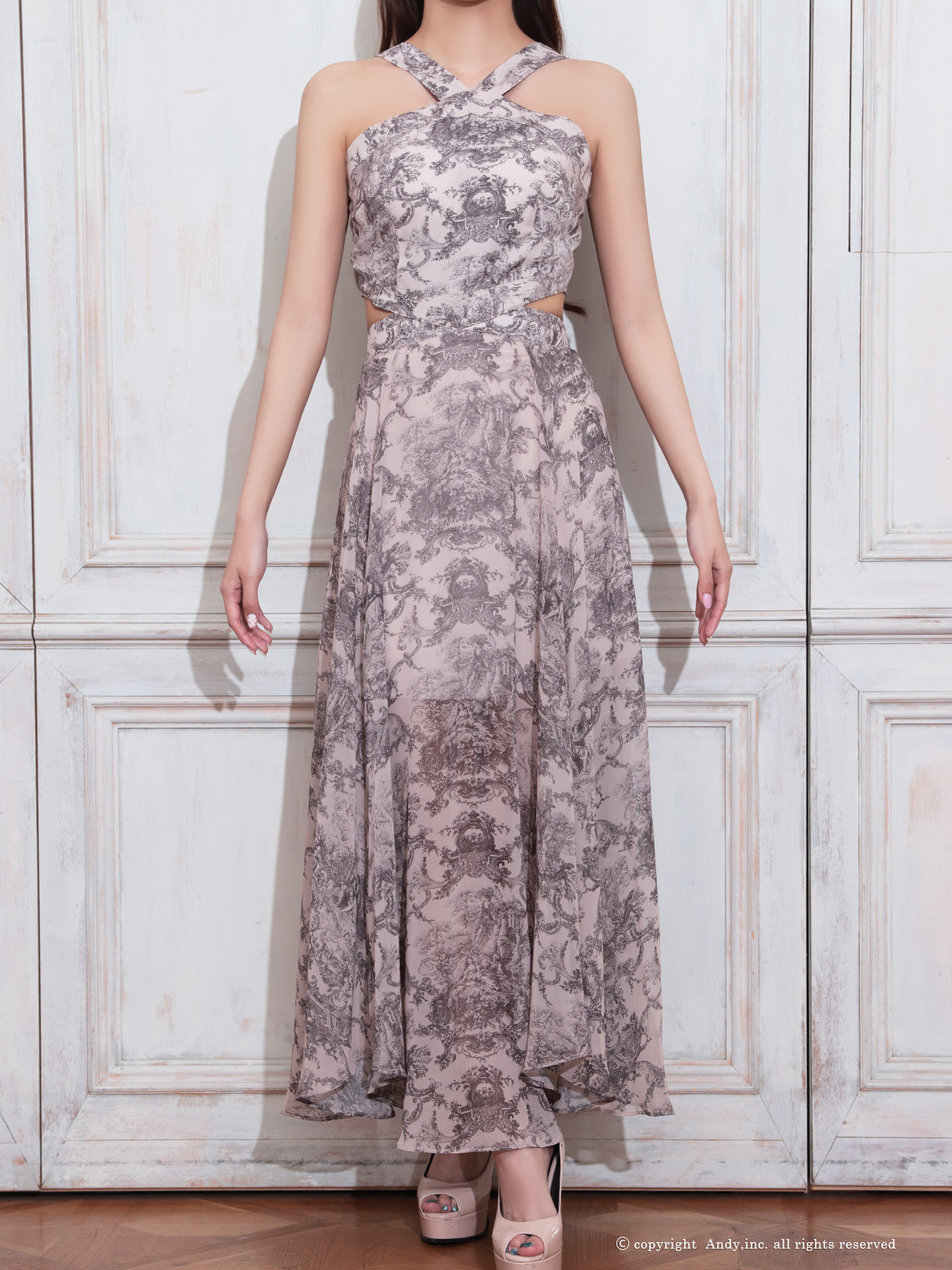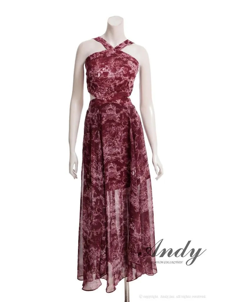 XSサイズあり【ANDY/アンディ】ホルターネック/ クラシカルプリント/ ウエストカット/ シフォン/ フレア/ マキシ丈/ ワンピース/ ロングドレス/ キャバドレスlong[OF05]
