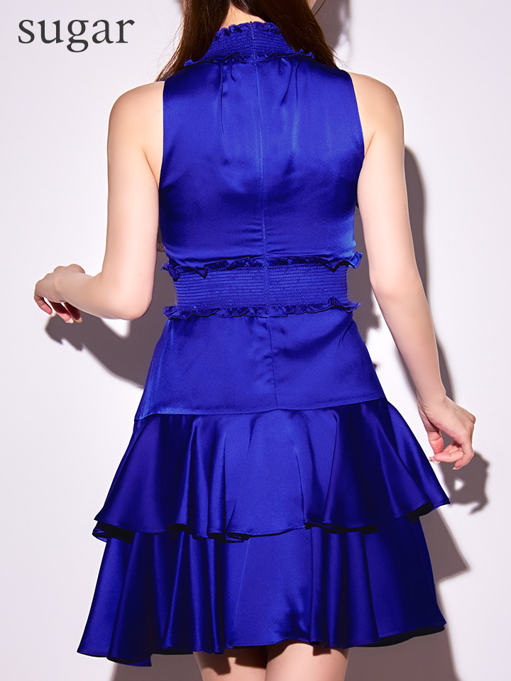 XS-Lサイズあり【GINZA COUTURE/銀座クチュール】フラワープリント/ シャーリング/ フリル/ ノースリーブ/ ハイネック/ Aライン/ フレア/ ワンピース/ ミニドレス/ キャバドレス[OF2] [LKC25129-RBL-S2510]