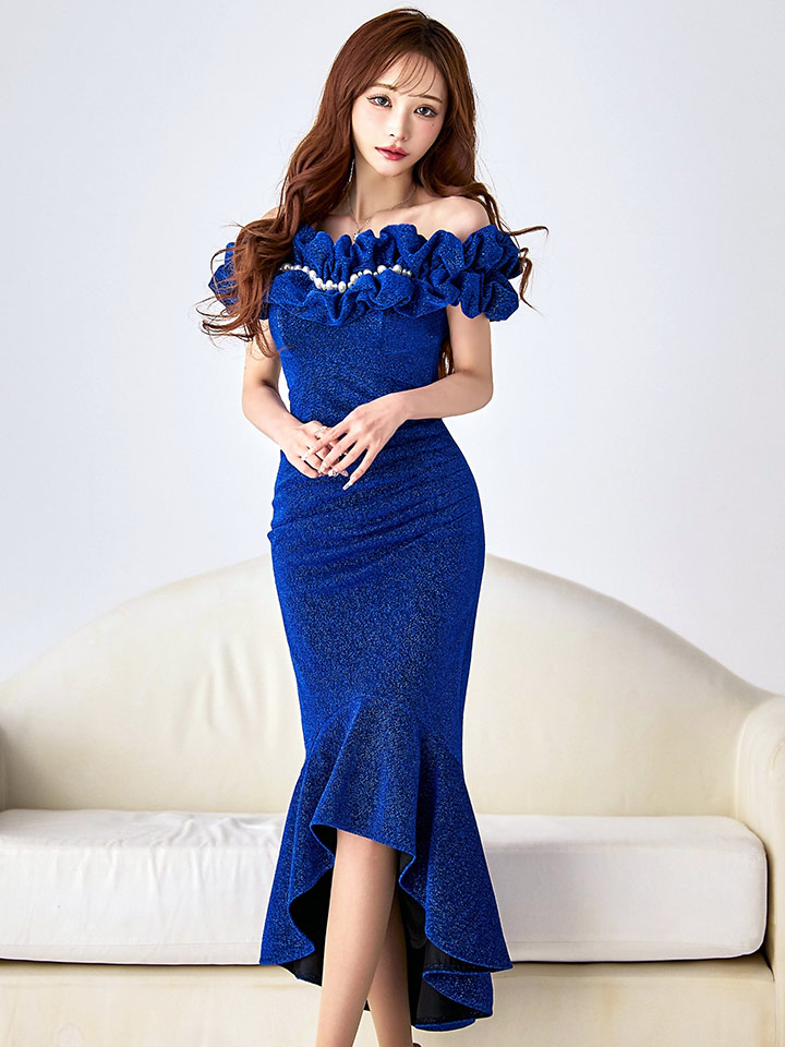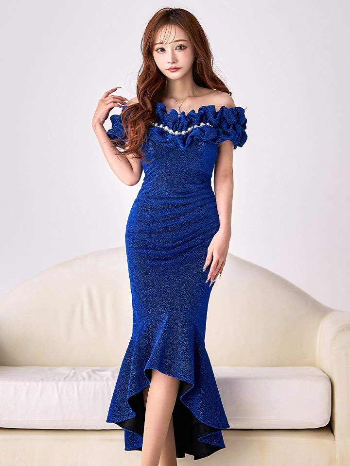 - > 【ISA FERRIS/ イサフェリス】【OF05】フリルオフショルダー/ パール/ ラメニット/ ストレッチ/ サイドタック/ ひざ丈/ マーメイド/ ミディアムドレス/ キャバドレス