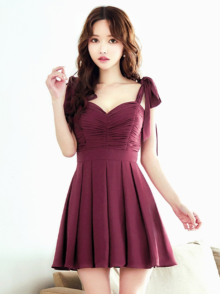 XS-Lサイズあり【Donia Quinn / ドニアクイーン】 ギャザートップス/ ショルダーリボン/ ノースリーブ/ ハイウエスト切替/ ワンカラー/ フレア/ ワンピース/ ミニドレス/ キャバドレス[OF05] [Q60230Y-Wine-S2510]