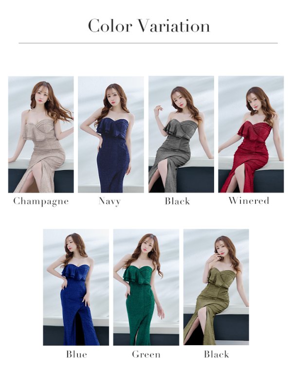 【MONOQLO/モノクロ】アシンメトリー/ フリル/ ベア/ ラメ/ ストレッチ/ スリット/ タイト/ ロングドレス/ キャバドレス/ long【OF2C】[OF2]