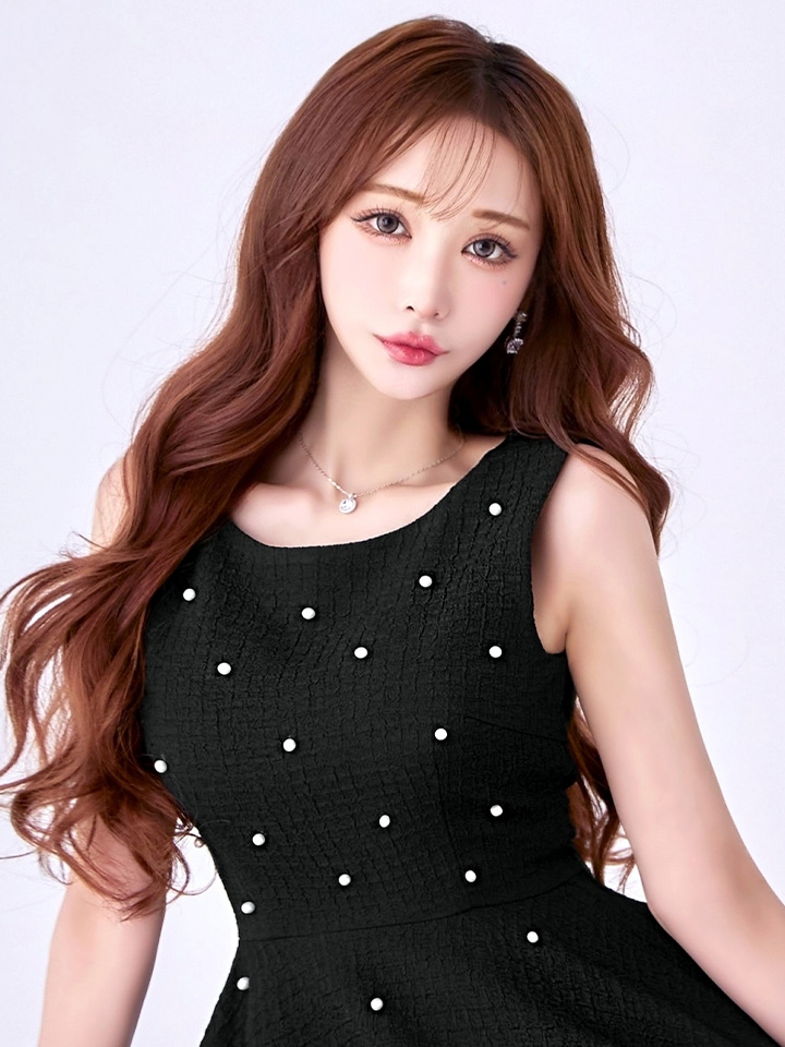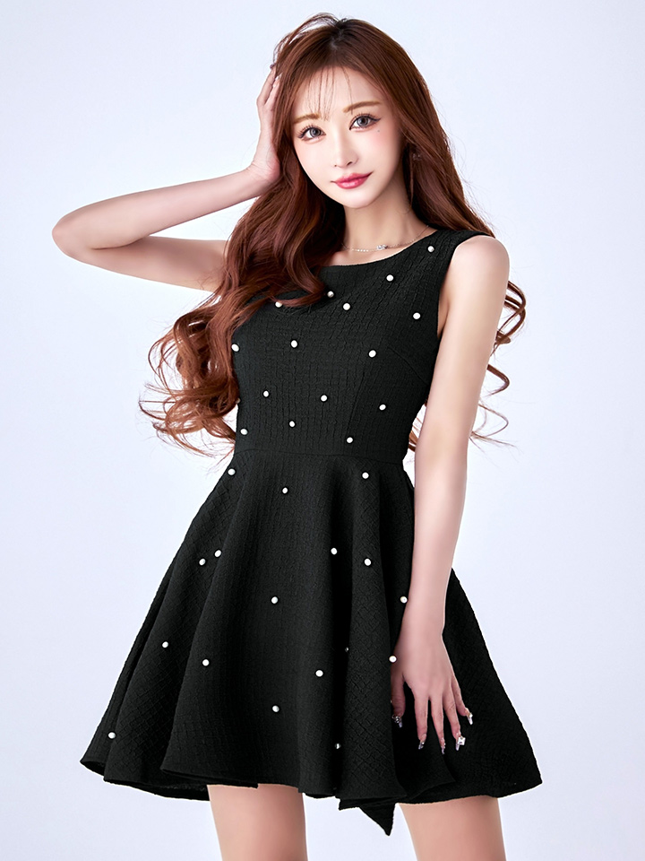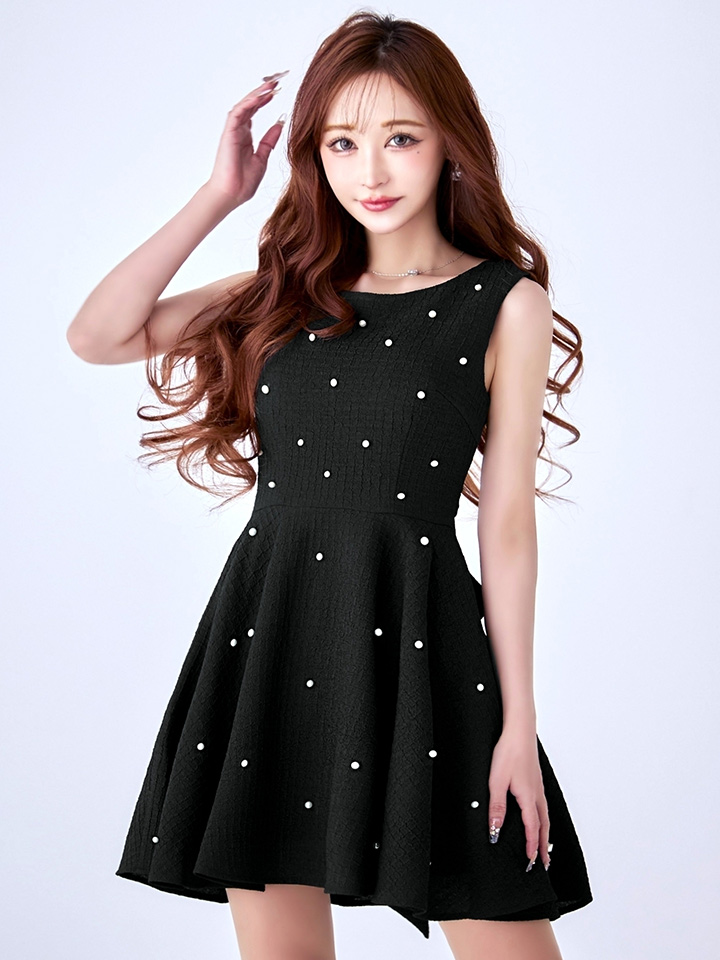 全体に散りばめられたパールが華やかなフレアミニドレス♡