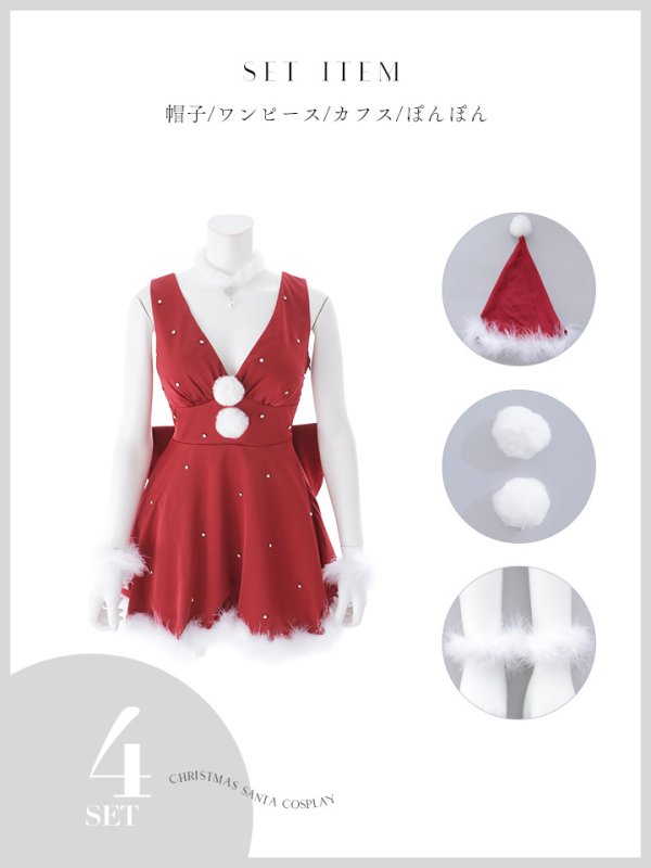 【即日発送】【サンタ】バックビッグリボンビジューワンピサンタコスプレ【コスプレ5点セット】【S-Lサイズ/1カラー】[OF04]