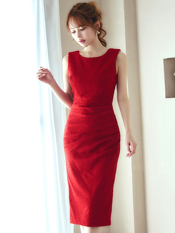 【ISA FERRIS/ イサフェリス】【OF05】シンプル/ ラメ/ ノースリーブ/ タック/ ストレッチ/ 膝丈/ タイト/ ミディアムドレス/ キャバドレス [F60203H-DKR-S2510]