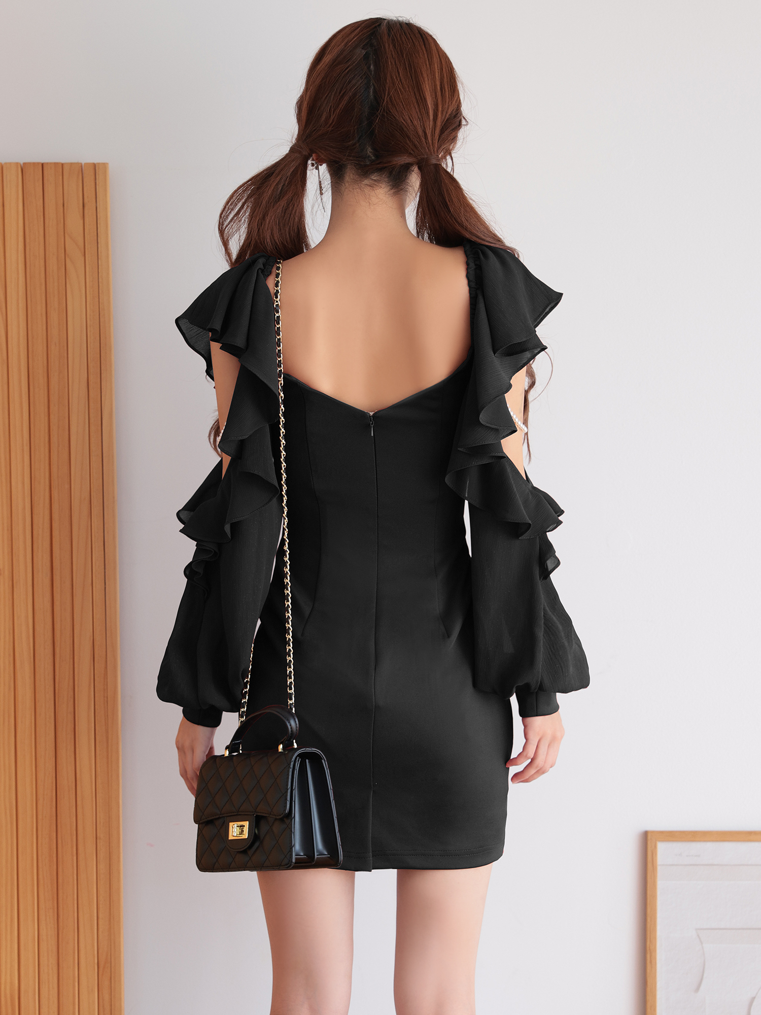 肩のスリットと重なり合うフリルが、動くたびに軽やかな表情を生み出します。
