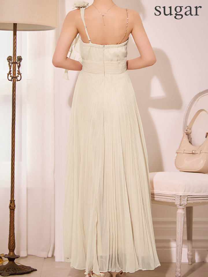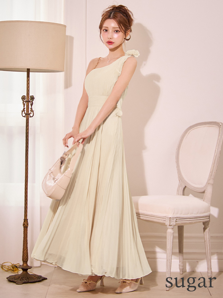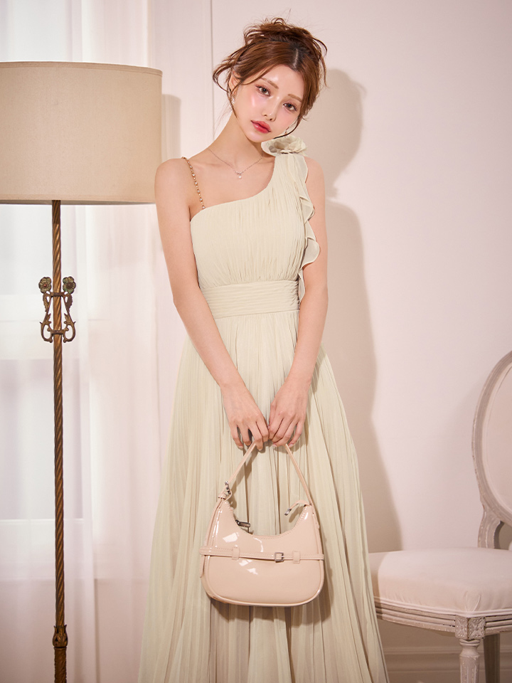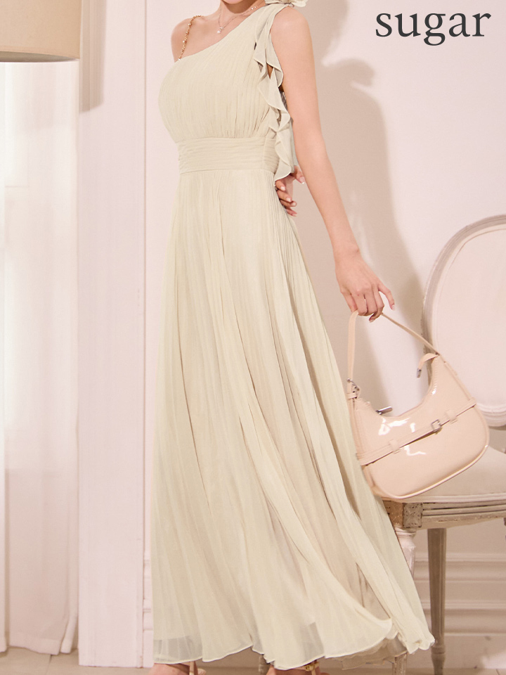 【JEAN MACLEAN/ジャンマクレーン】ワンショル/ シフォン/ プリーツ/ メロウ/ ショルダーチェーン/ フレア/ ロングドレス/ キャバドレスlong[OF2A] [51969-JM-vanilla-S251107]