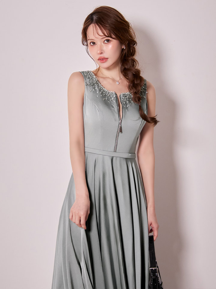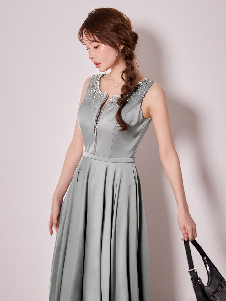 デコルテラインを華やかに彩るビジューが魅力のフレアロングドレス♡