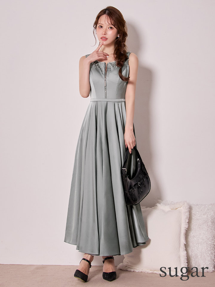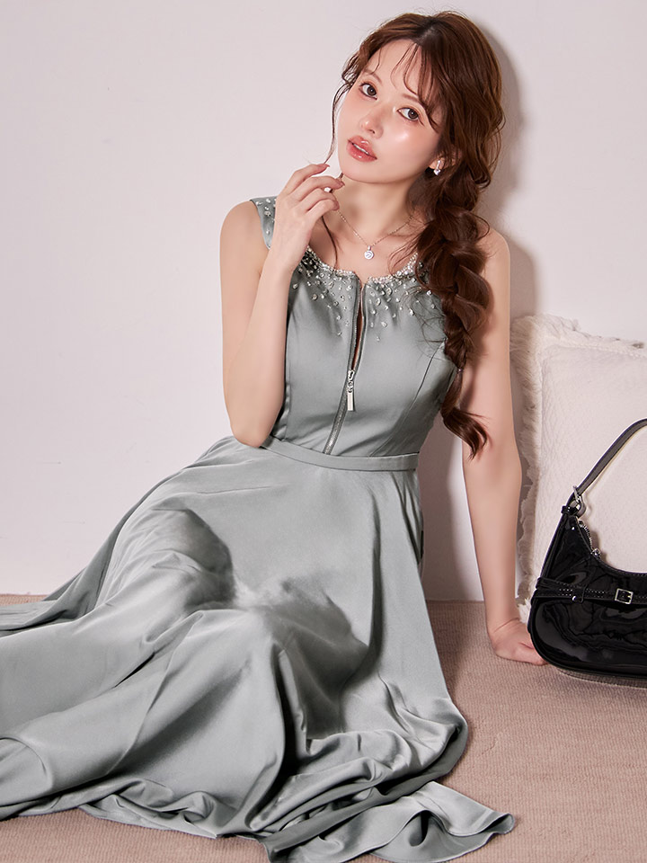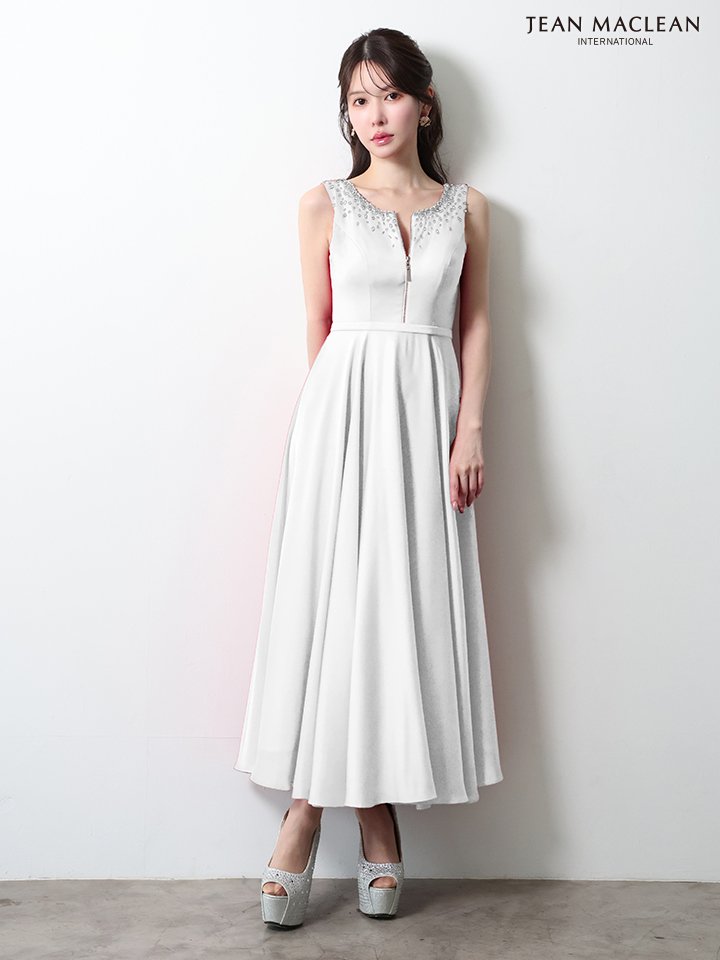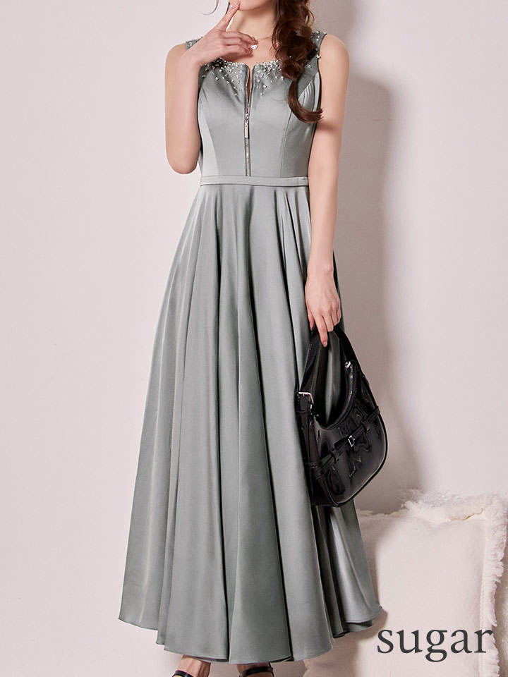 【予約商品/11月下旬発送予定】【JEAN MACLEAN/ジャンマクレーン】サテン/ ネックビジュー/ バストジップ/ ノースリーブ/ フレア/ ロングドレス/ キャバドレスlong[OF2A]