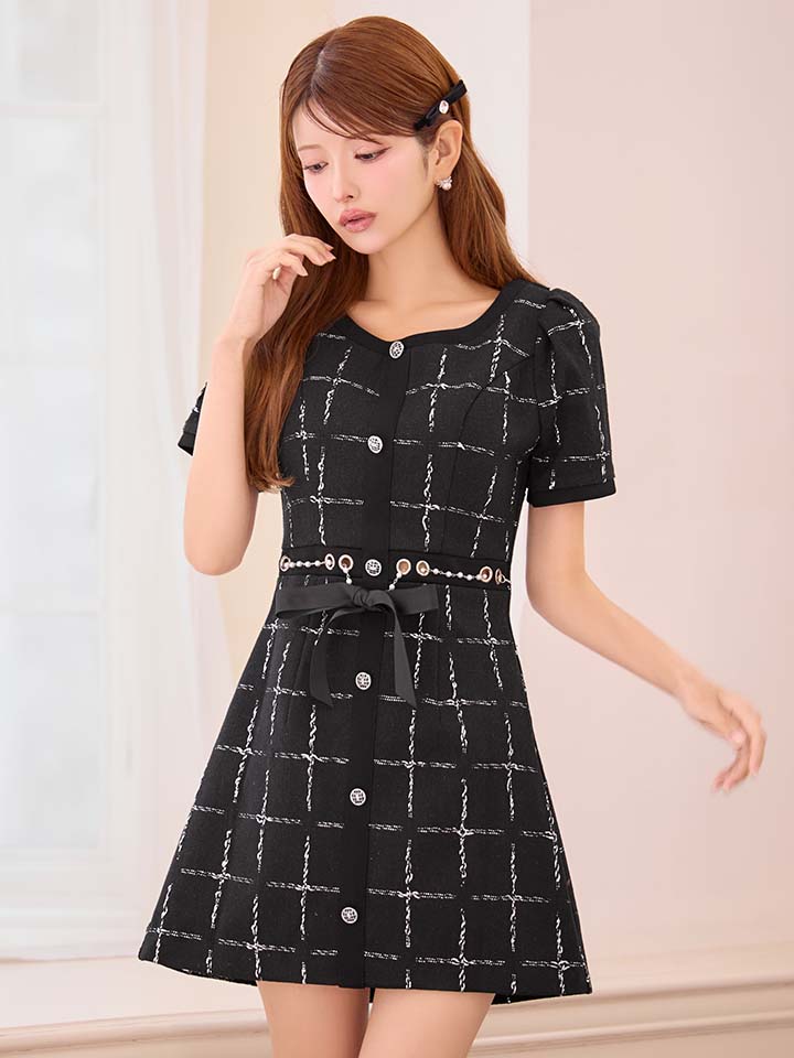 XSサイズあり【IRMA/イルマ】ラメ糸/ チェックツイード/ リボンベルト/ 半袖/ 袖あり/ フレア/ ミニドレス/ キャバドレス[OF2A] [55107-IR-B-S251110]