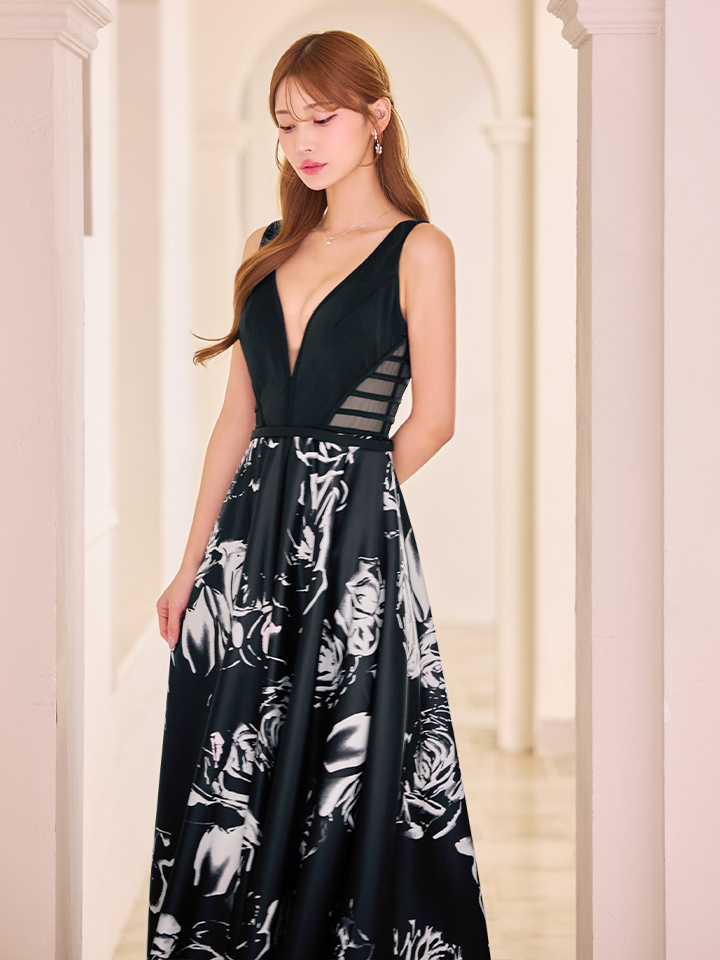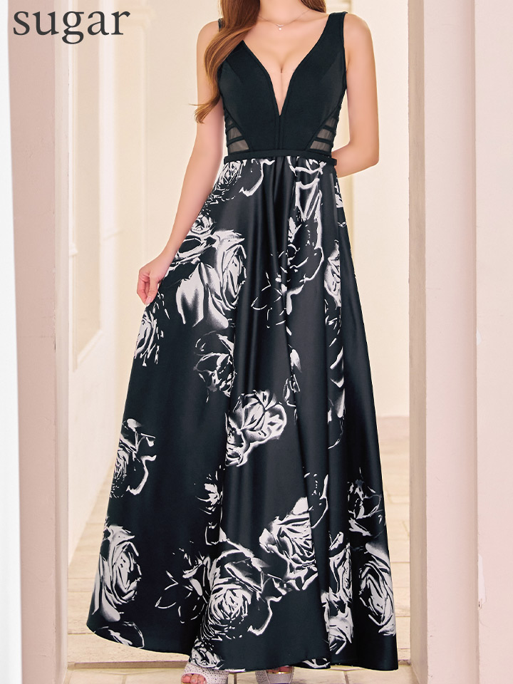 XS-Lサイズあり【SETTAN/セッタン】フラワープリント/ 花柄/ ノースリーブ/ フレア/ Aライン/ ロングドレス / サテン / シースルー / キャバドレス long[OF2]