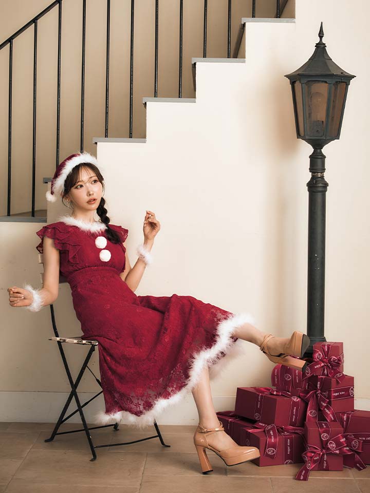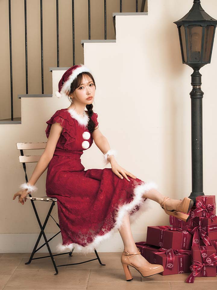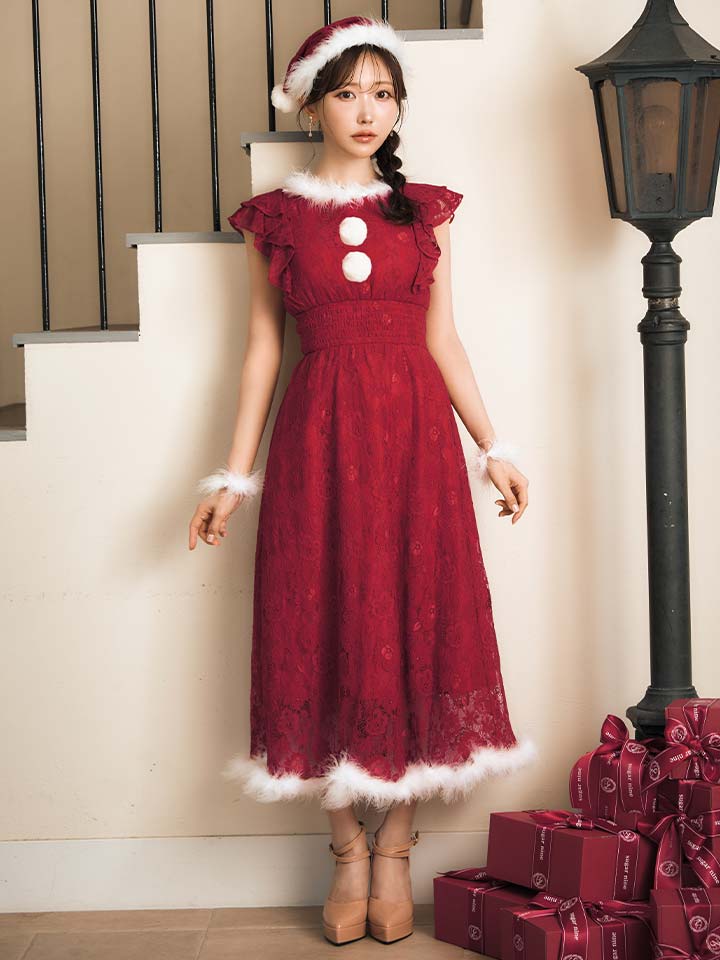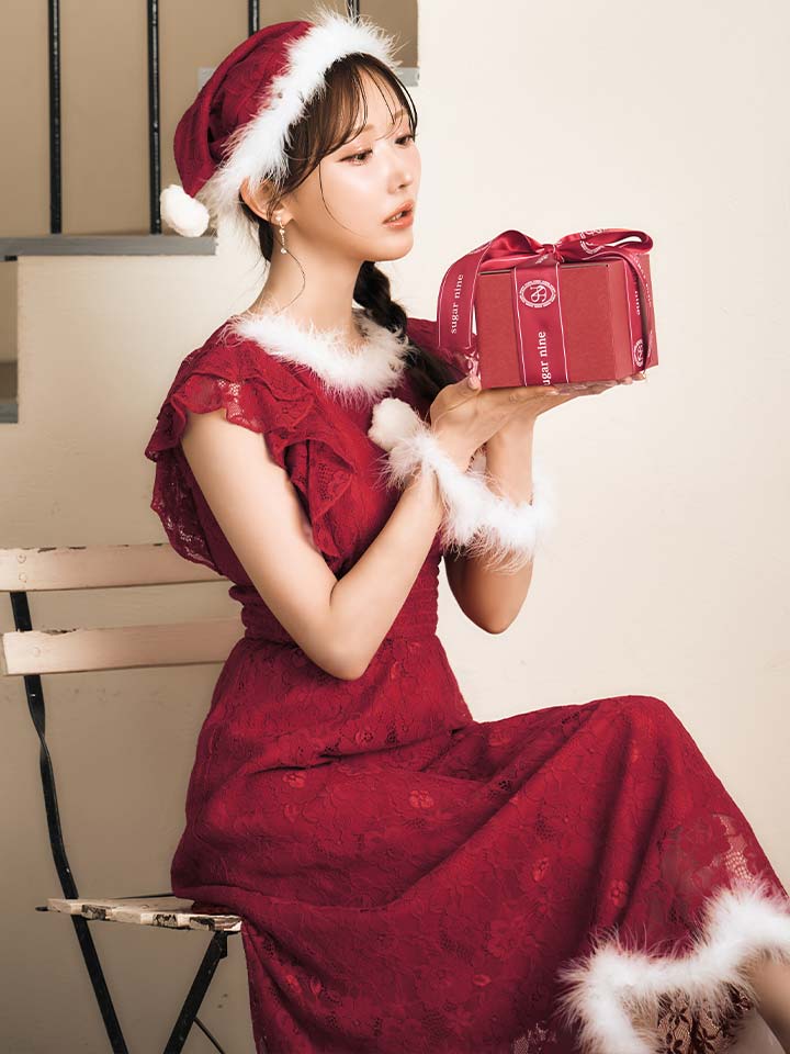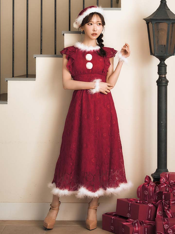 総レースにショルダーフリルが目を惹くワンピースサンタコスプレ
