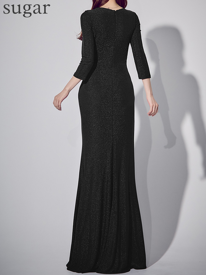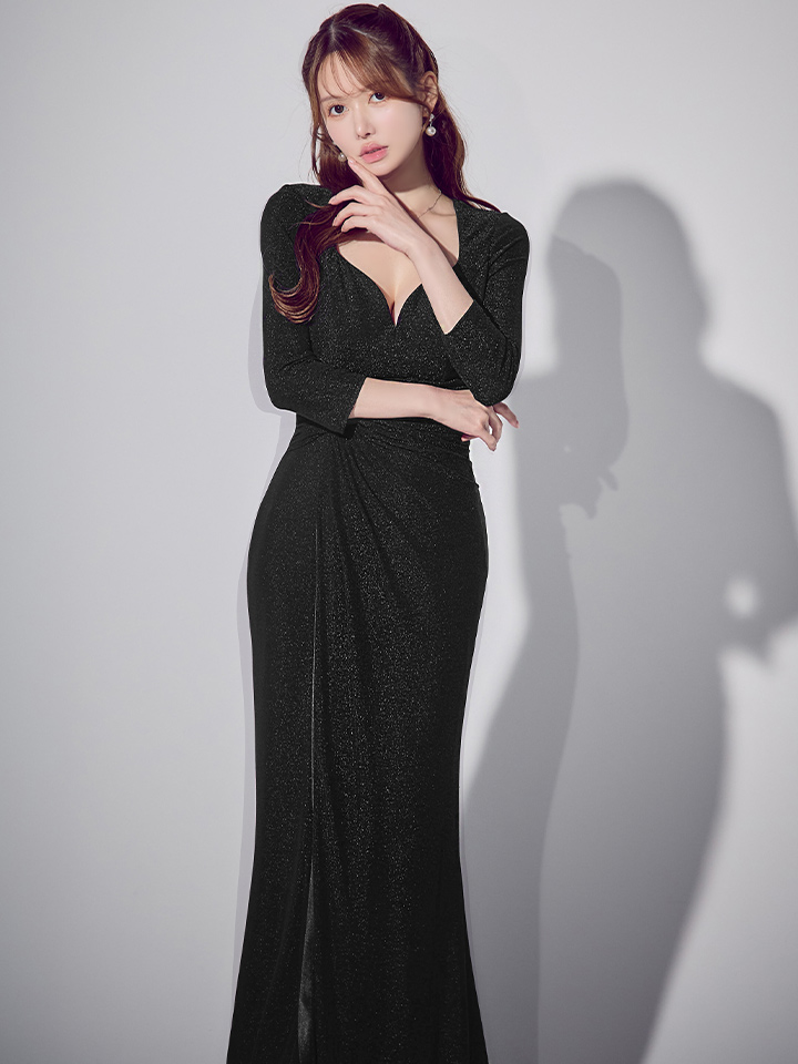 【JEAN MACLEAN/ジャンマクレーン】袖あり/ ラメニット/ ラップデザイン/ ストレッチ/ スリット/ ロングドレス/ キャバドレスlong[OF2A] [51782-JM-B-S2511]
