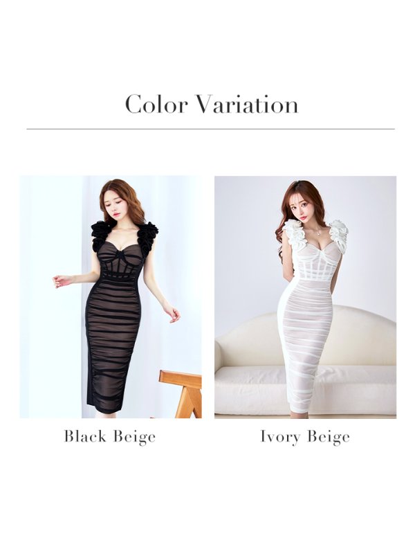 - > 【ISA FERRIS/ イサフェリス】【OF05】フリルショルダー/ ノースリーブ/ ギャザー/ ストレッチ/ 膝丈/ タイト/ ミディアムドレス/ キャバドレス