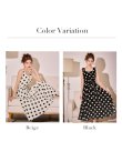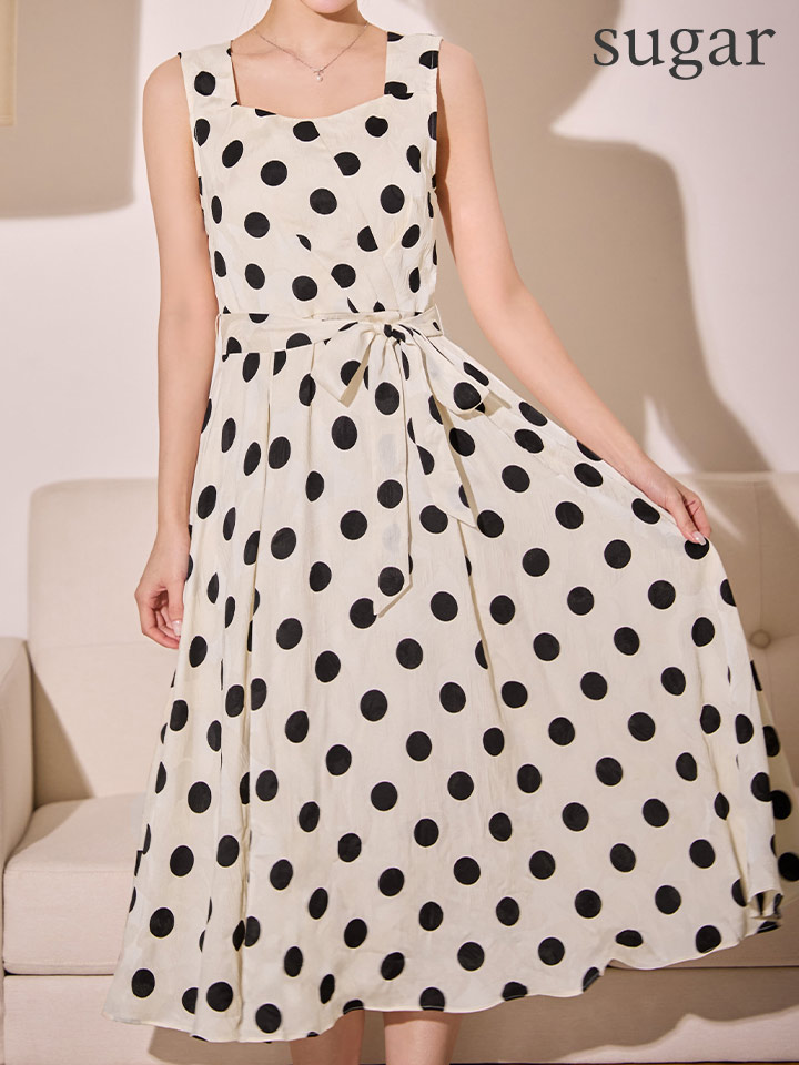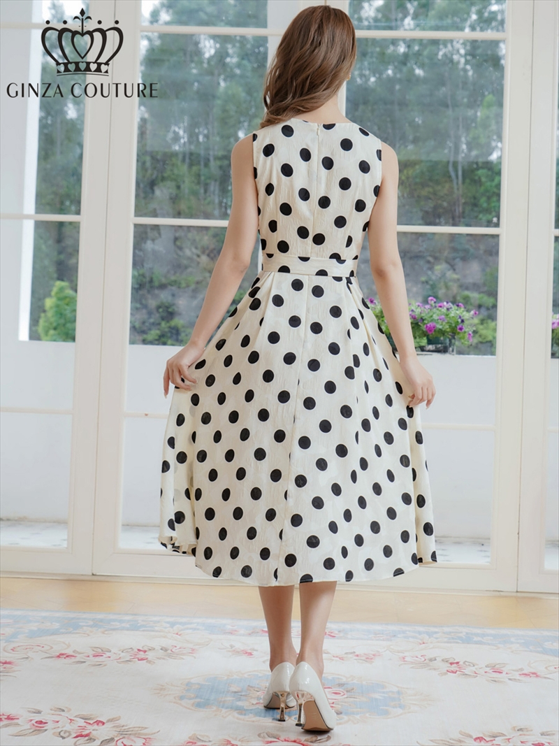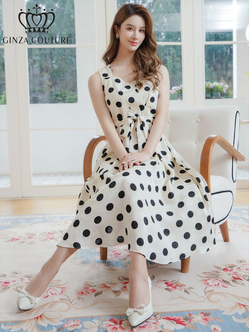 XS-Lサイズあり 【GINZA COUTURE/銀座クチュール】ドット/ サテンジャガード/ 花柄/ ノースリーブ/ リボンベルト/ Aライン/ フレア/ ワンピース/ ミディアムドレス/ キャバドレス[OF2] [LKC25064-BE-S251107]