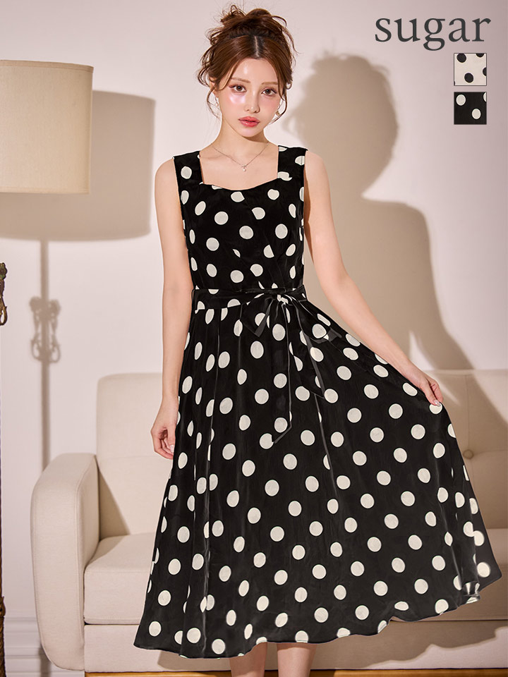 - > XS-Lサイズあり 【GINZA COUTURE/銀座クチュール】ドット/ サテンジャガード/ 花柄/ ノースリーブ/ リボンベルト/ Aライン/ フレア/ ワンピース/ ミディアムドレス/ キャバドレス[OF2]