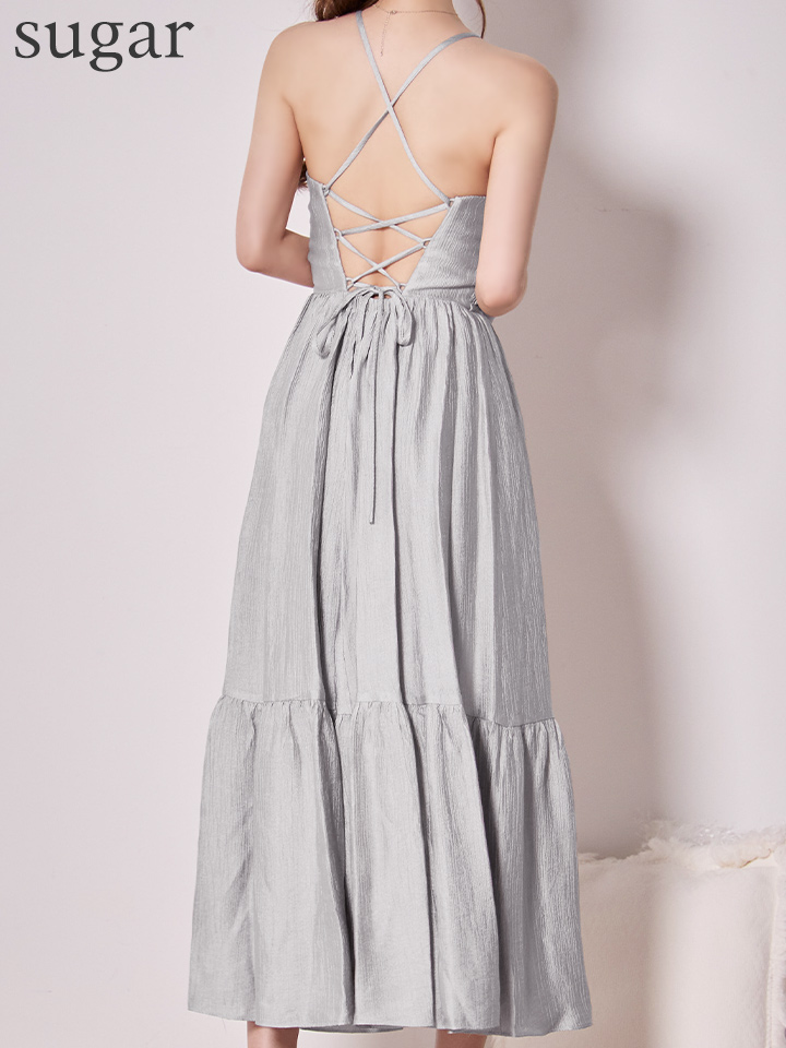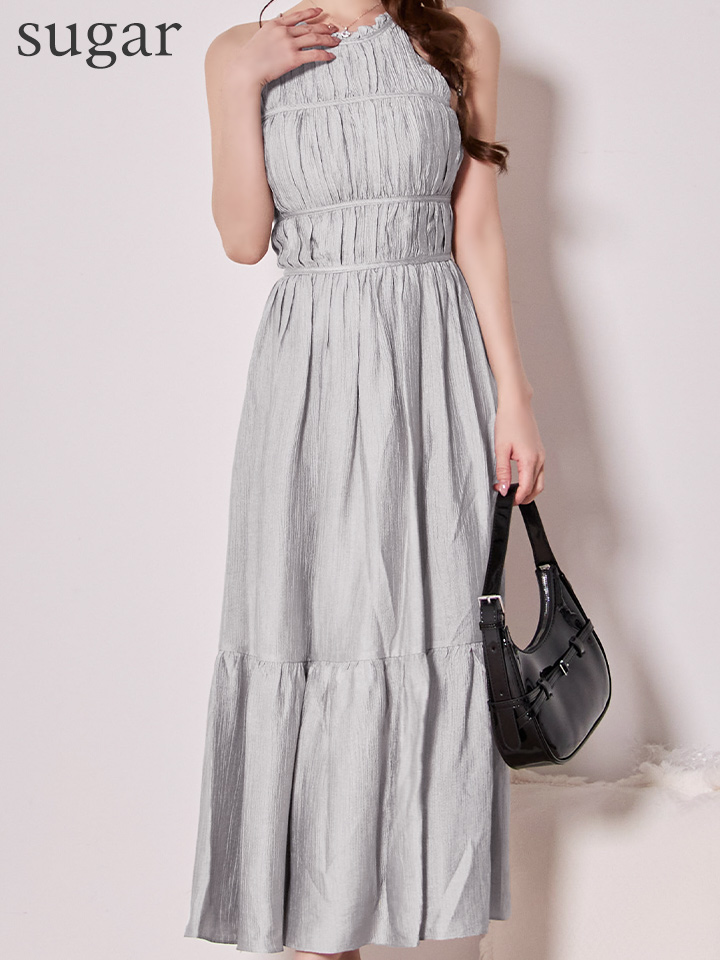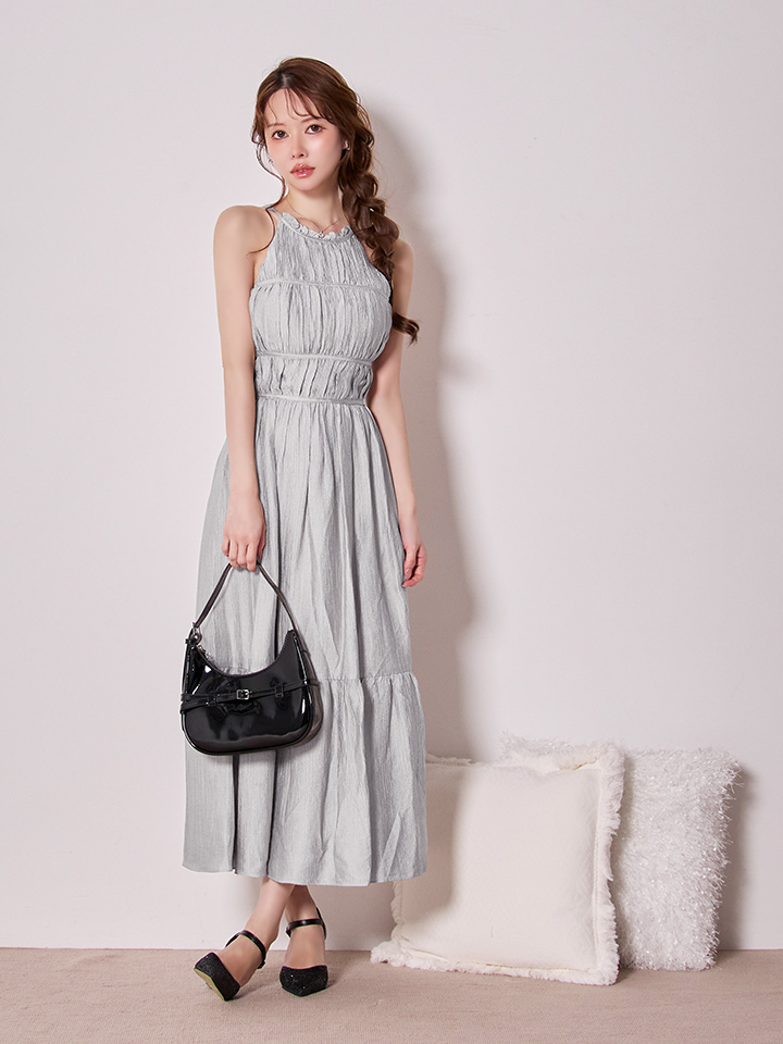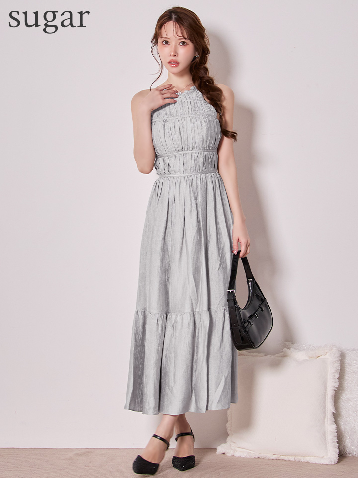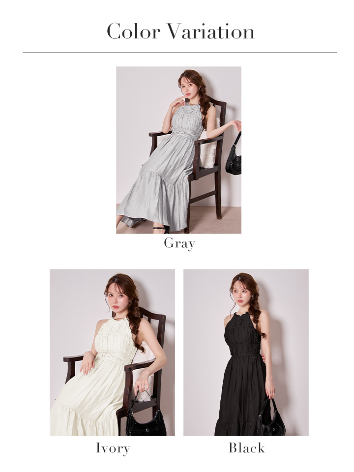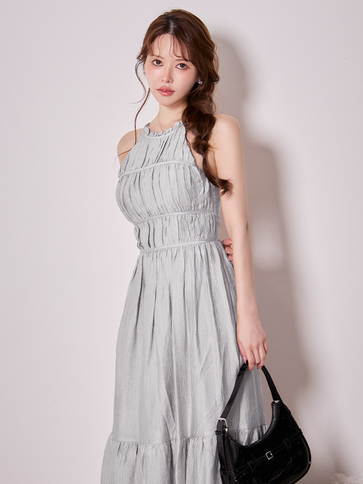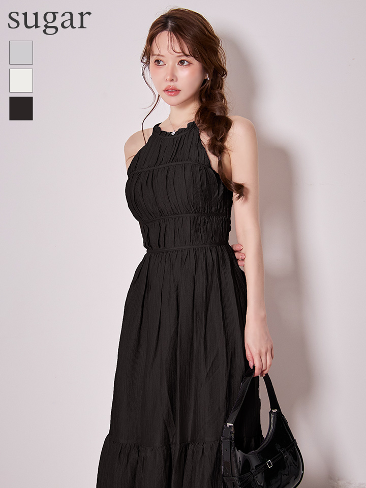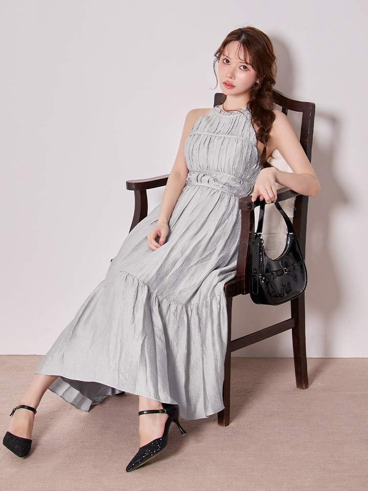 首元で結ぶホルターネックデザインがデコルテを美しく見せ、華奢見え効果も抜群。