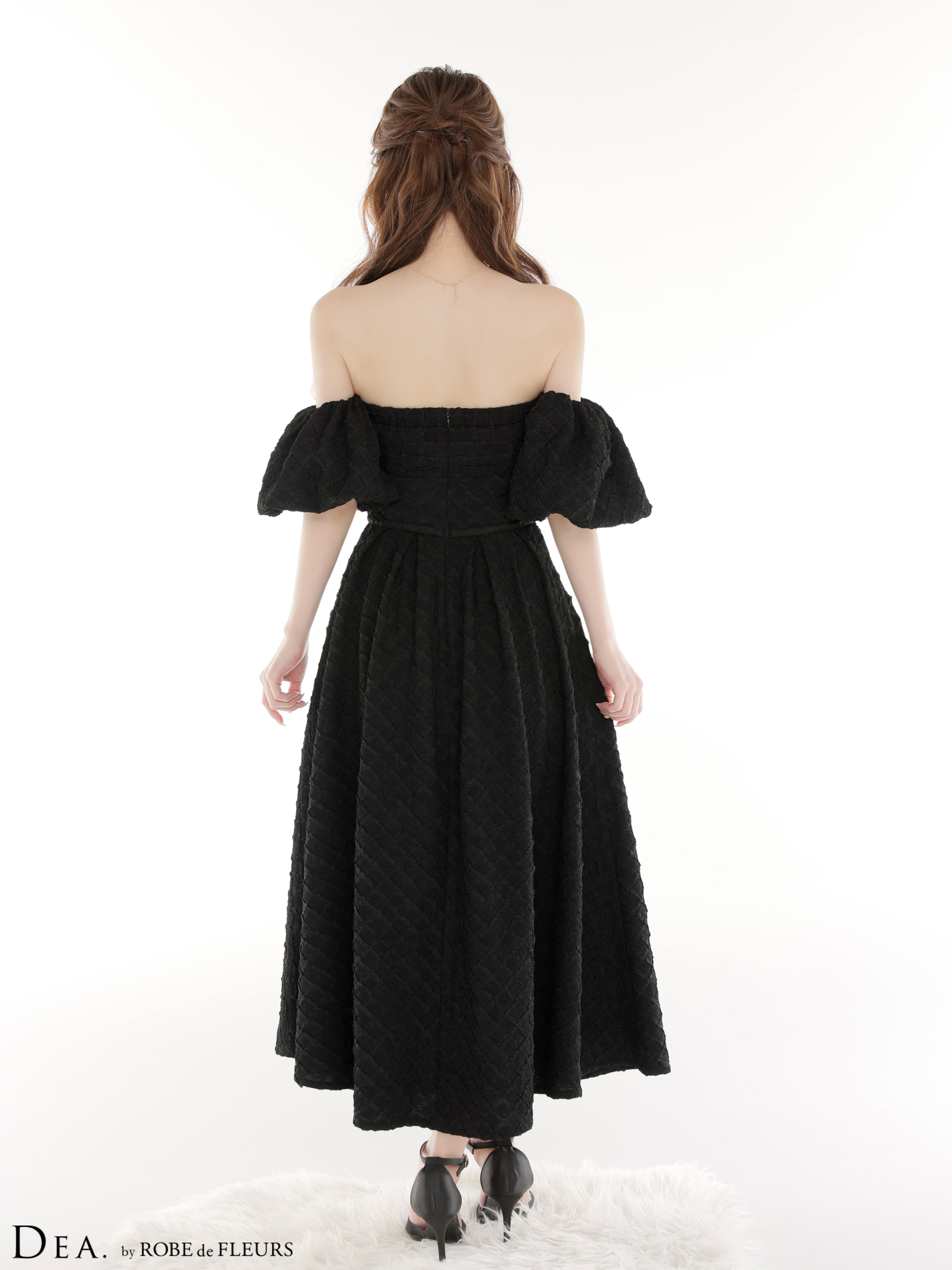 Lサイズあり【DEA./ディア】ラメ/ ジャガード/ オフショル/ バルーンスリーブ/ フレア/ ミディアムドレス/ キャバドレス long[OF08] [DE4334-B-2511]
