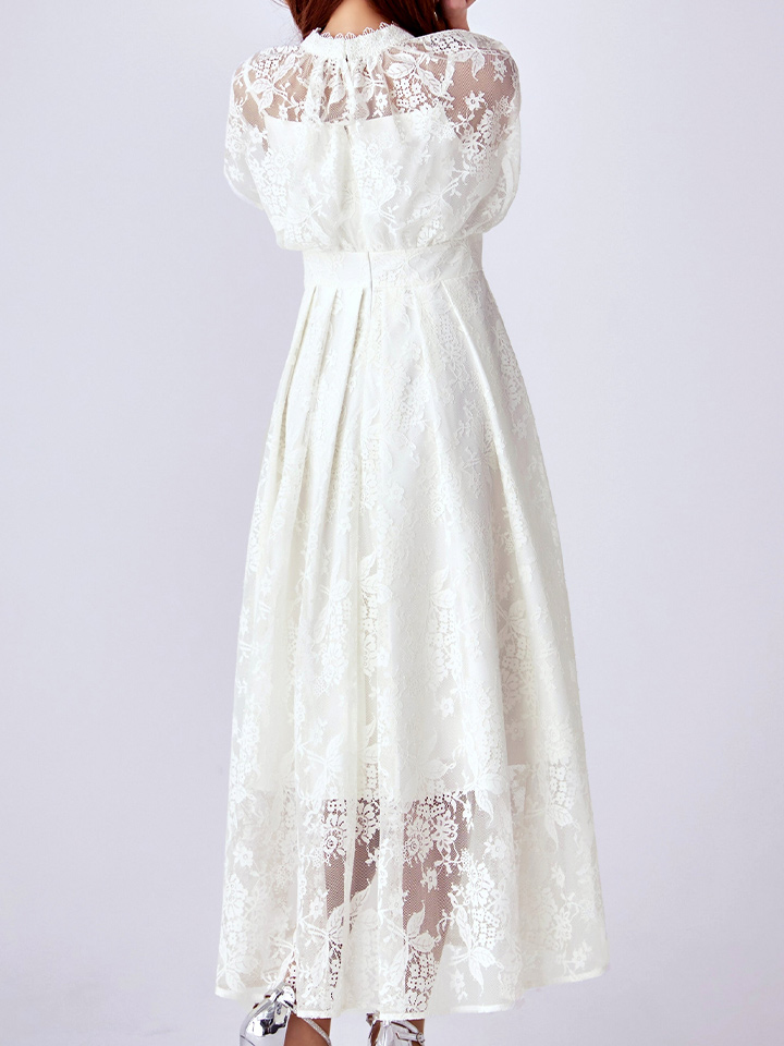 透け感のあるフラワーレースにハイネックが大人クラシカルな雰囲気のミモレ丈ワンピースドレス♡