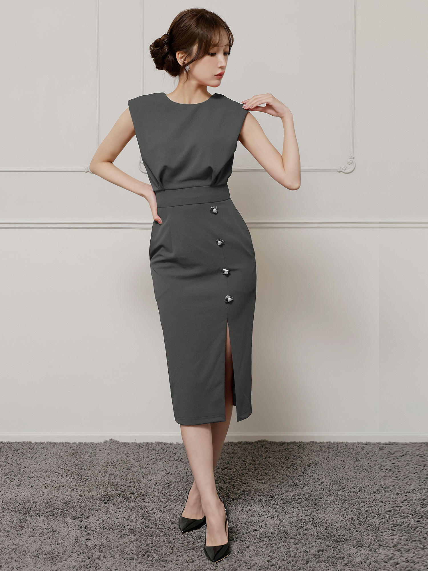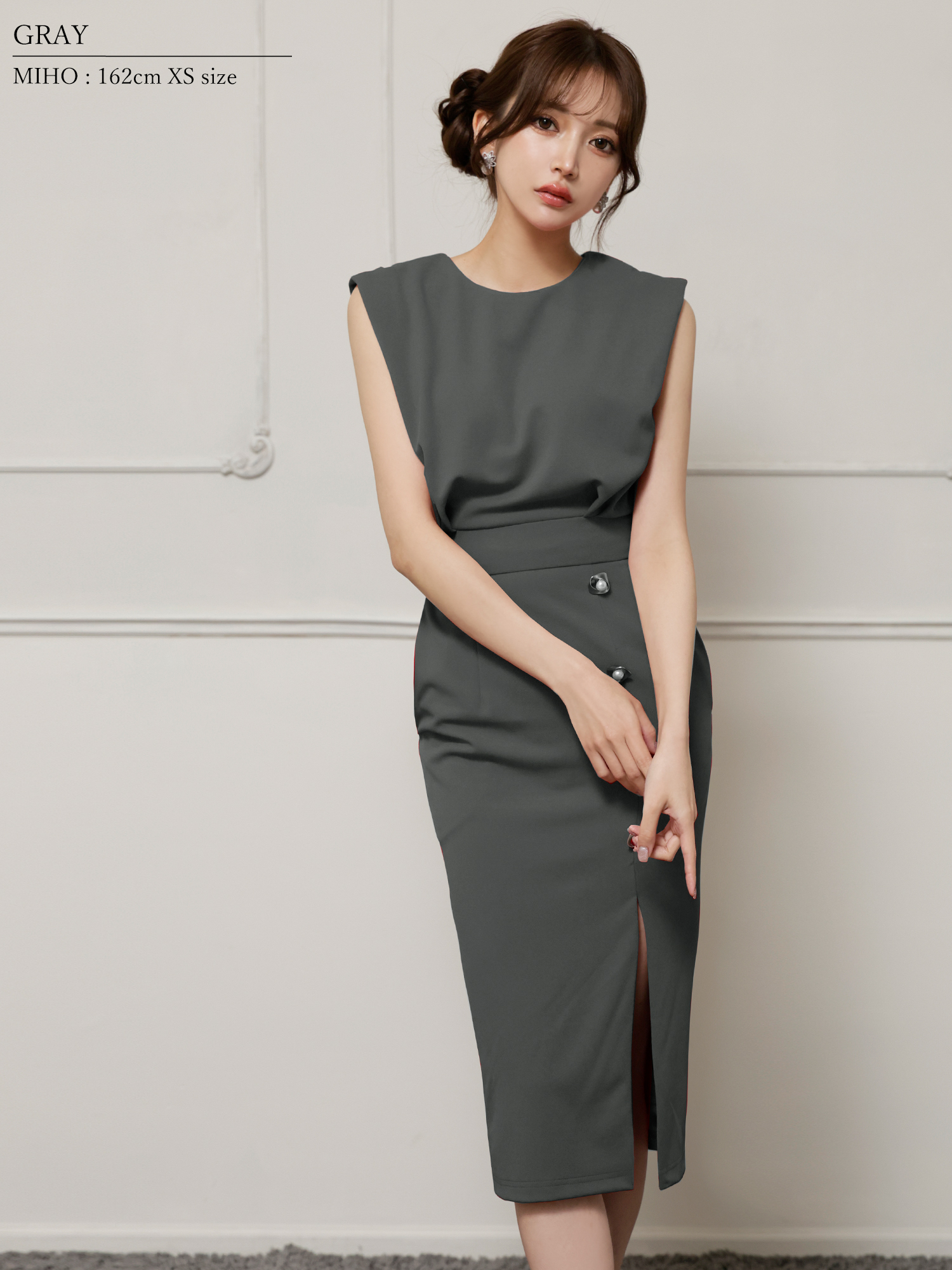 【予約商品/11月中旬-11月下旬発送予定】XSサイズあり【Veautt/ヴュート】【OF05】ノースリーブ/ ウエストマーク/ ボタン/ サイドスリット/ タイト/ ミディアムドレス/ キャバドレス [VT082527-GY-2511]