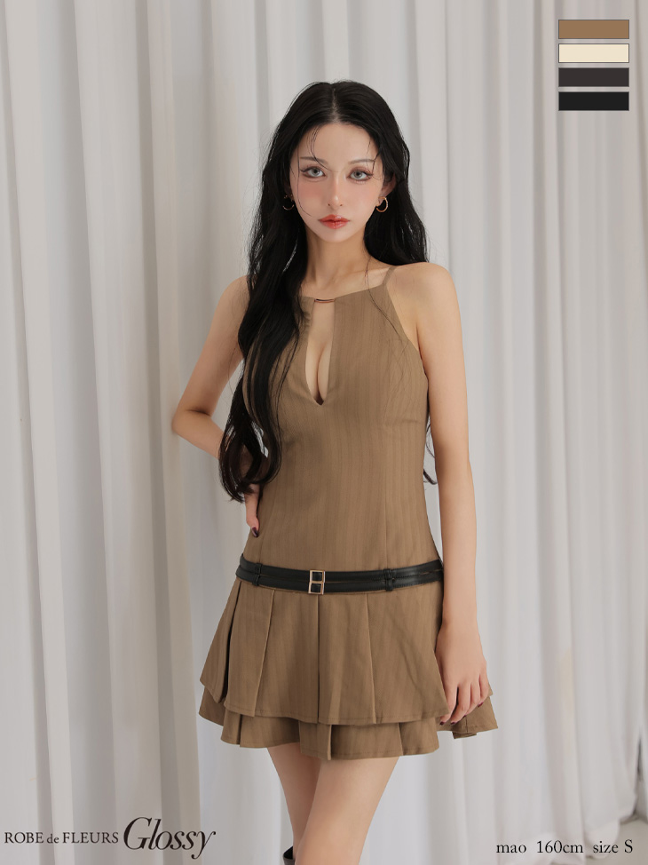 XSサイズあり【Glossy/グロッシー】ヘリンボーン/レザーベルト/ フレア/ ミニドレス/ キャバドレス[OF08]