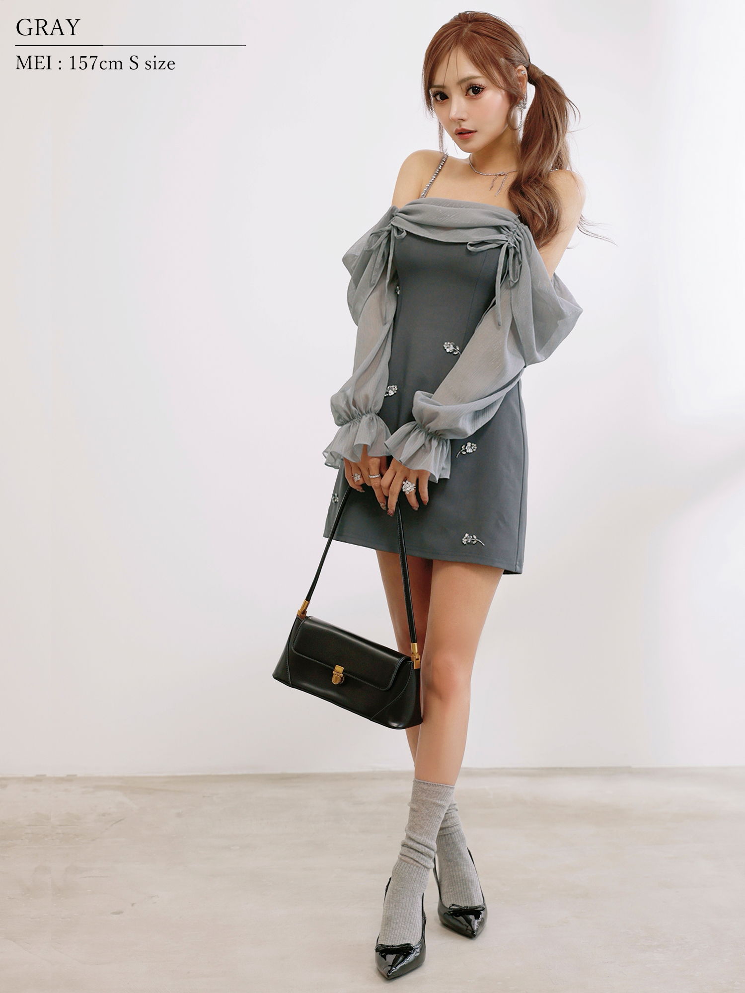 XSサイズあり【ANGEL R/エンジェルアール】オフショルダー/ ロングスリーブ/ シアー/ リボン/ フラワービジュー/ バイカラー/ フレア/ ミニドレス/ キャバドレス[OF2] [AR25873-GY-2511]