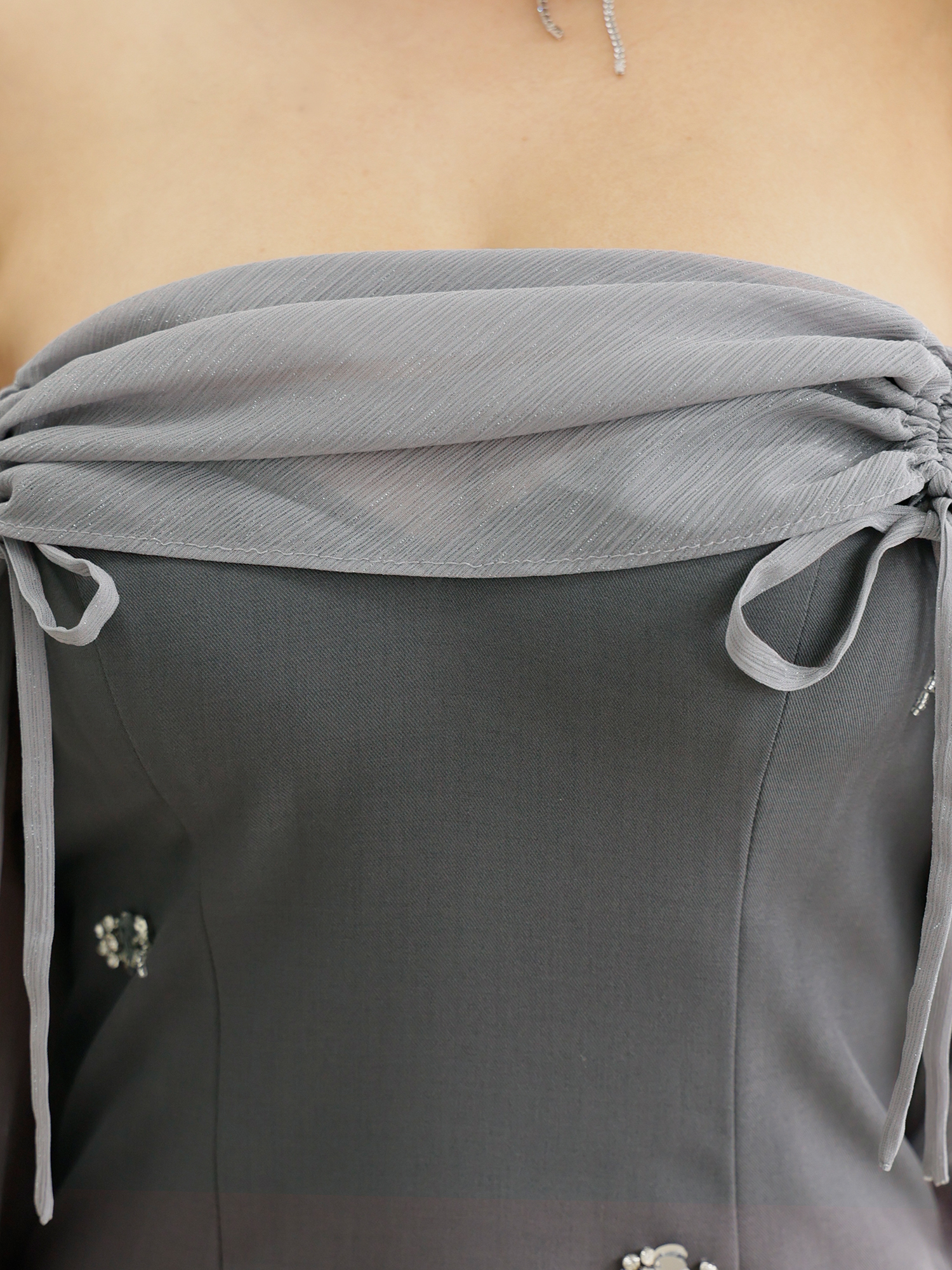 肩を美しく見せる抜け感シルエットで、特別なシーンにも映える一枚。