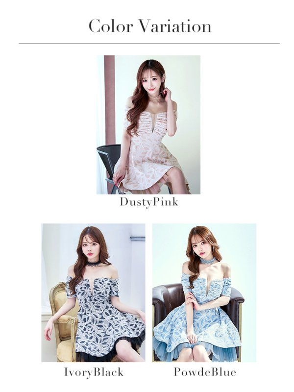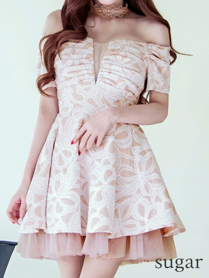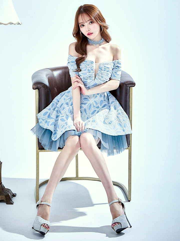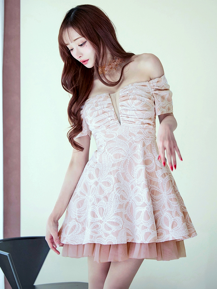 XS-Lサイズあり【Donia Quinn / ドニアクイーン】 オフショル/ 刺繍/ リボンモチーフ/ チョーカー付き/ バストシアー/ フレア/ ミニドレス/ キャバドレス[OF05] [Q60239Y-DusP-S2511]