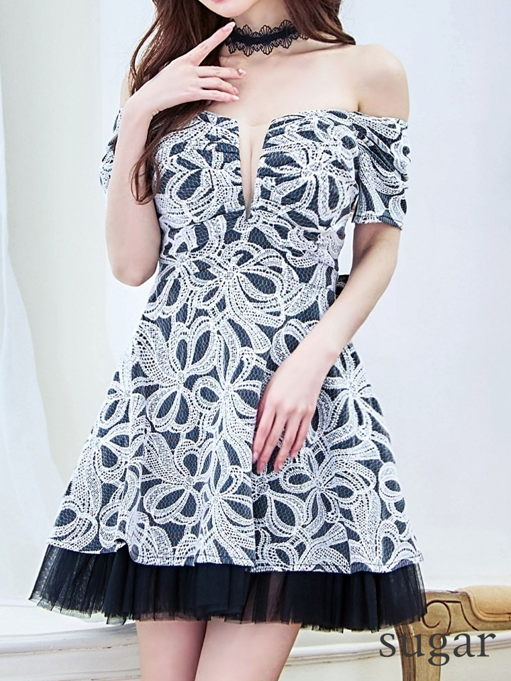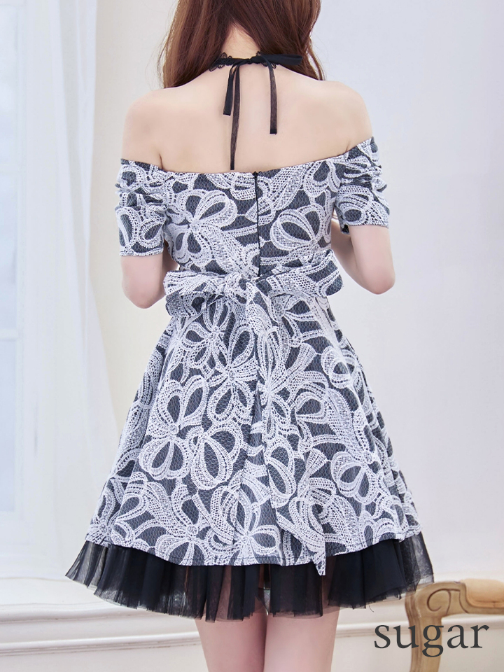 - > XS-Lサイズあり【Donia Quinn / ドニアクイーン】 オフショル/ 刺繍/ リボンモチーフ/ チョーカー付き/ バストシアー/ フレア/ ミニドレス/ キャバドレス[OF05]